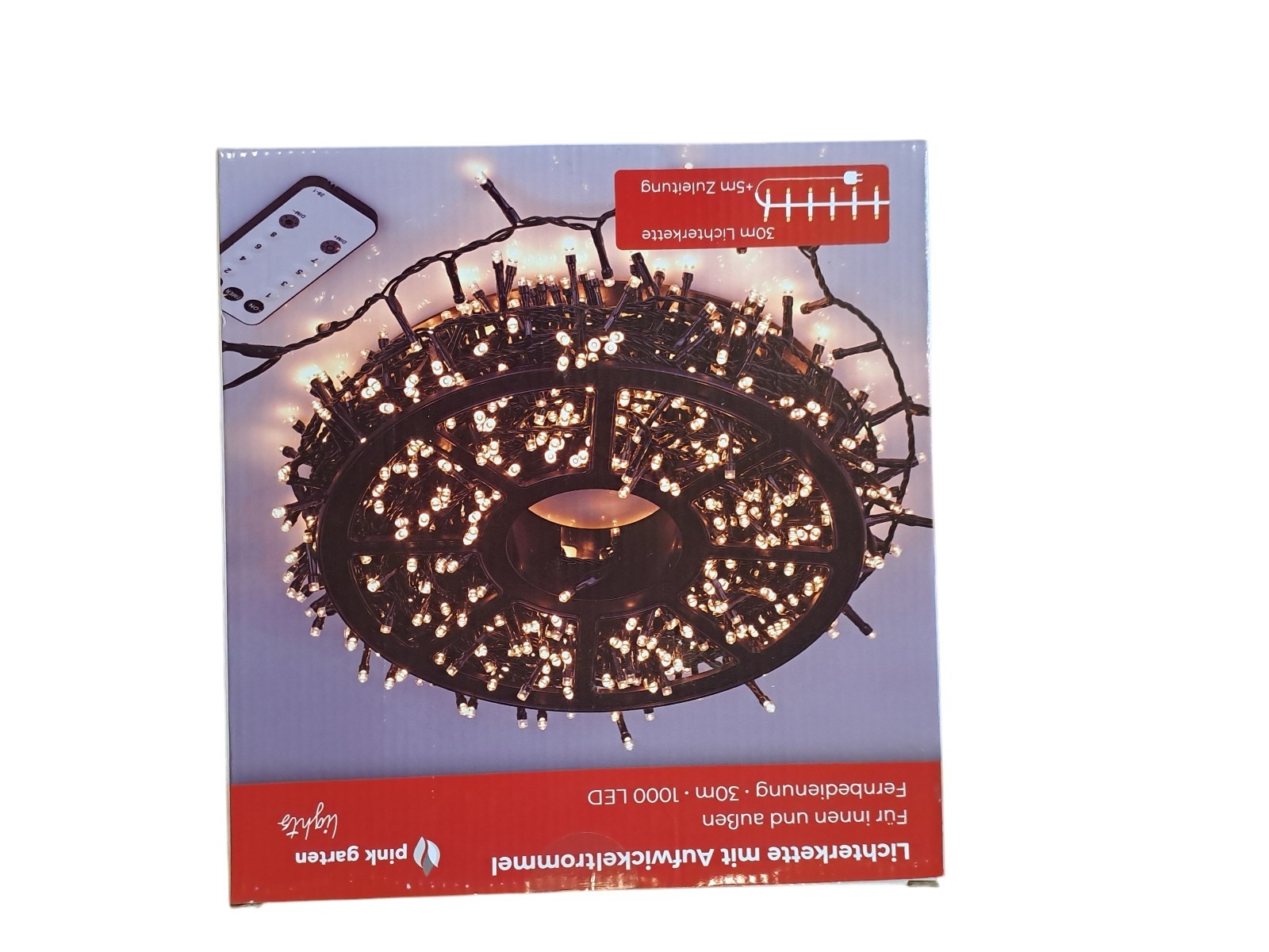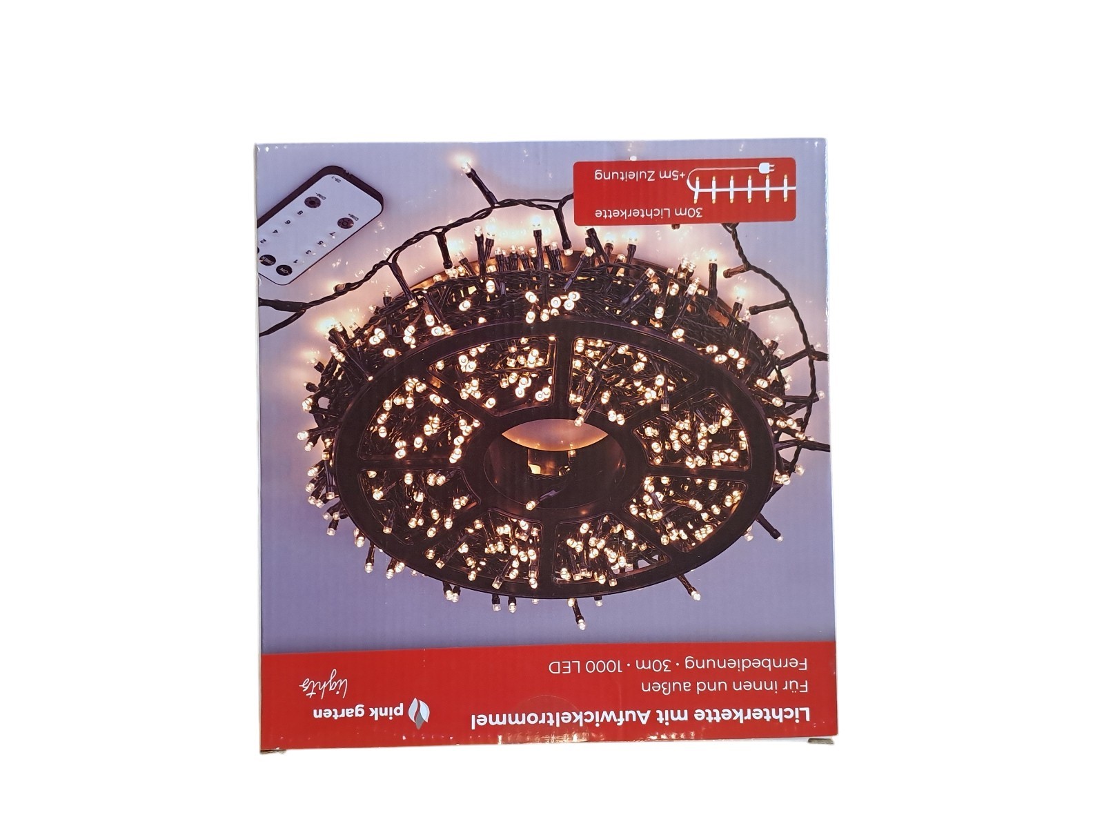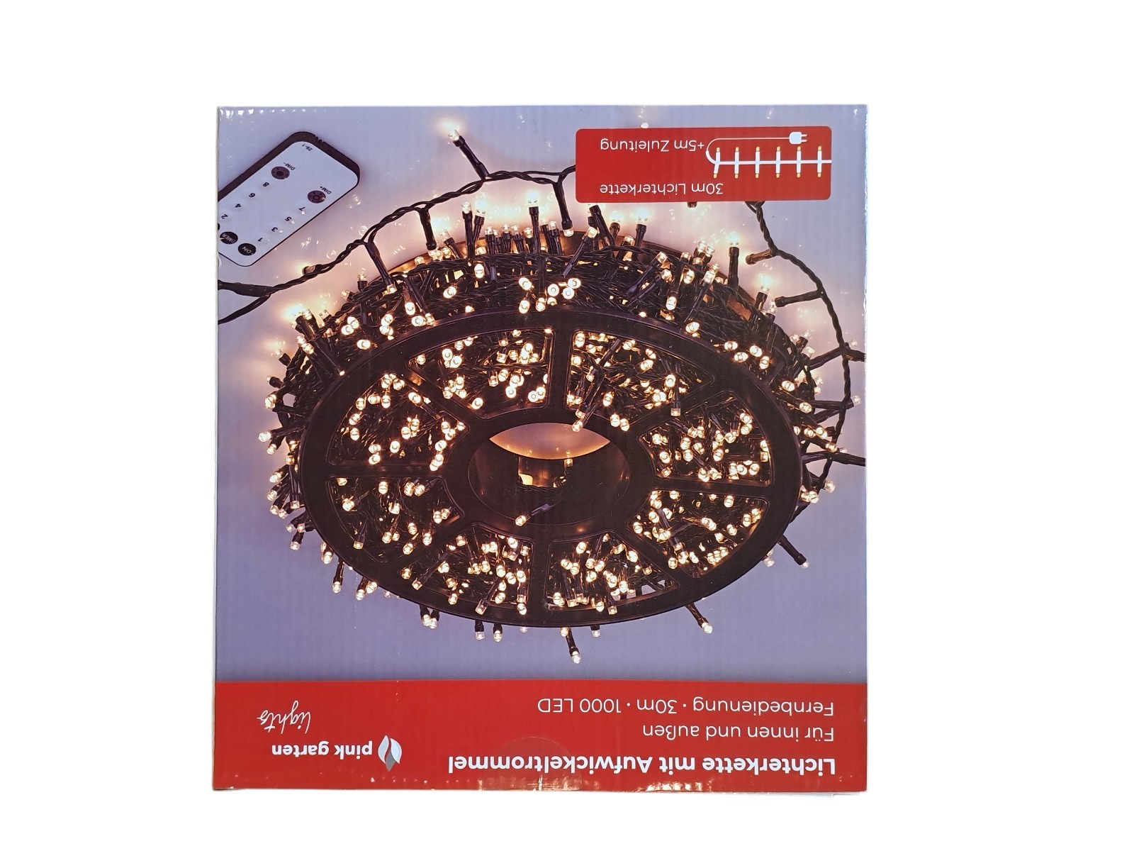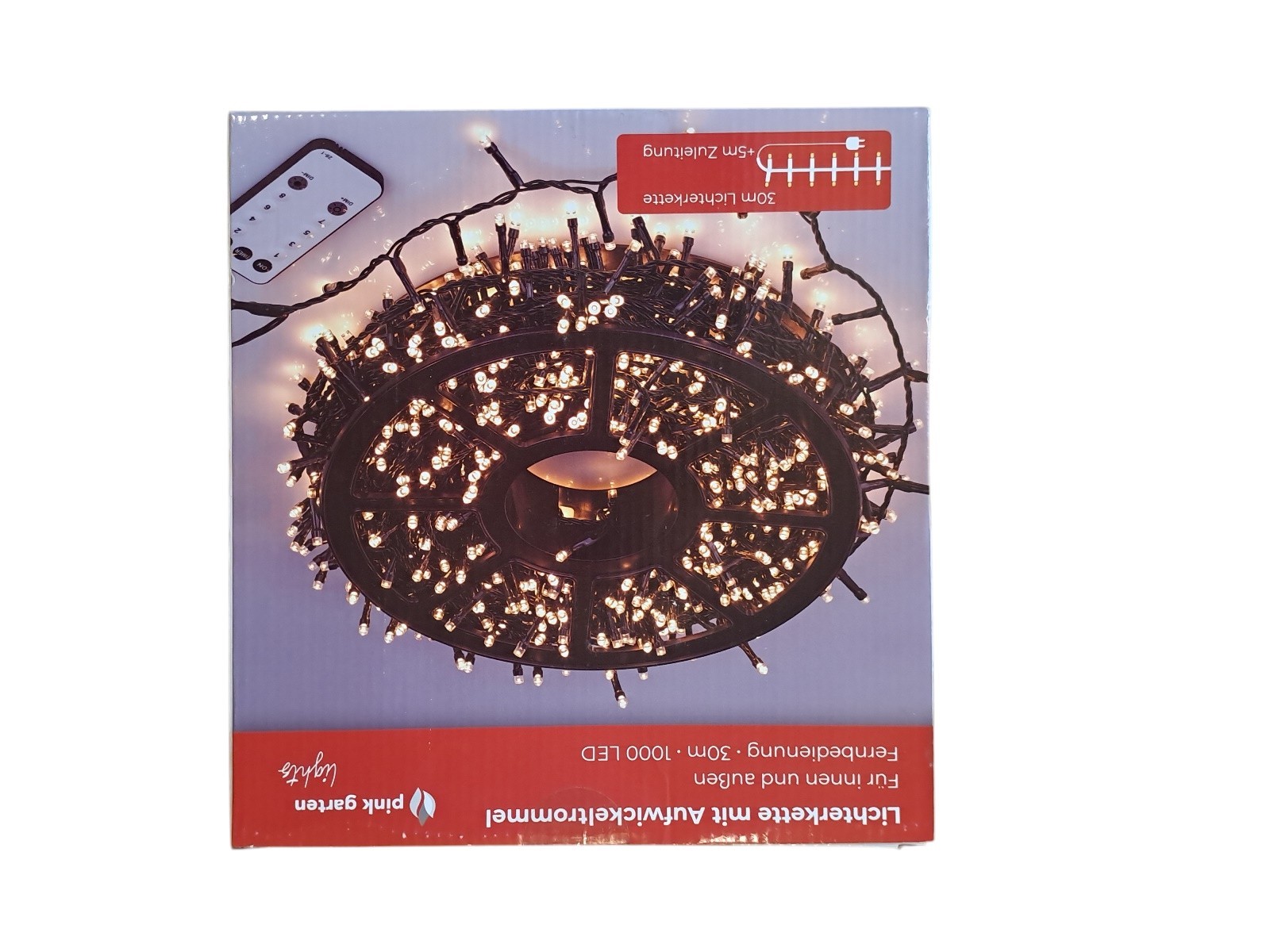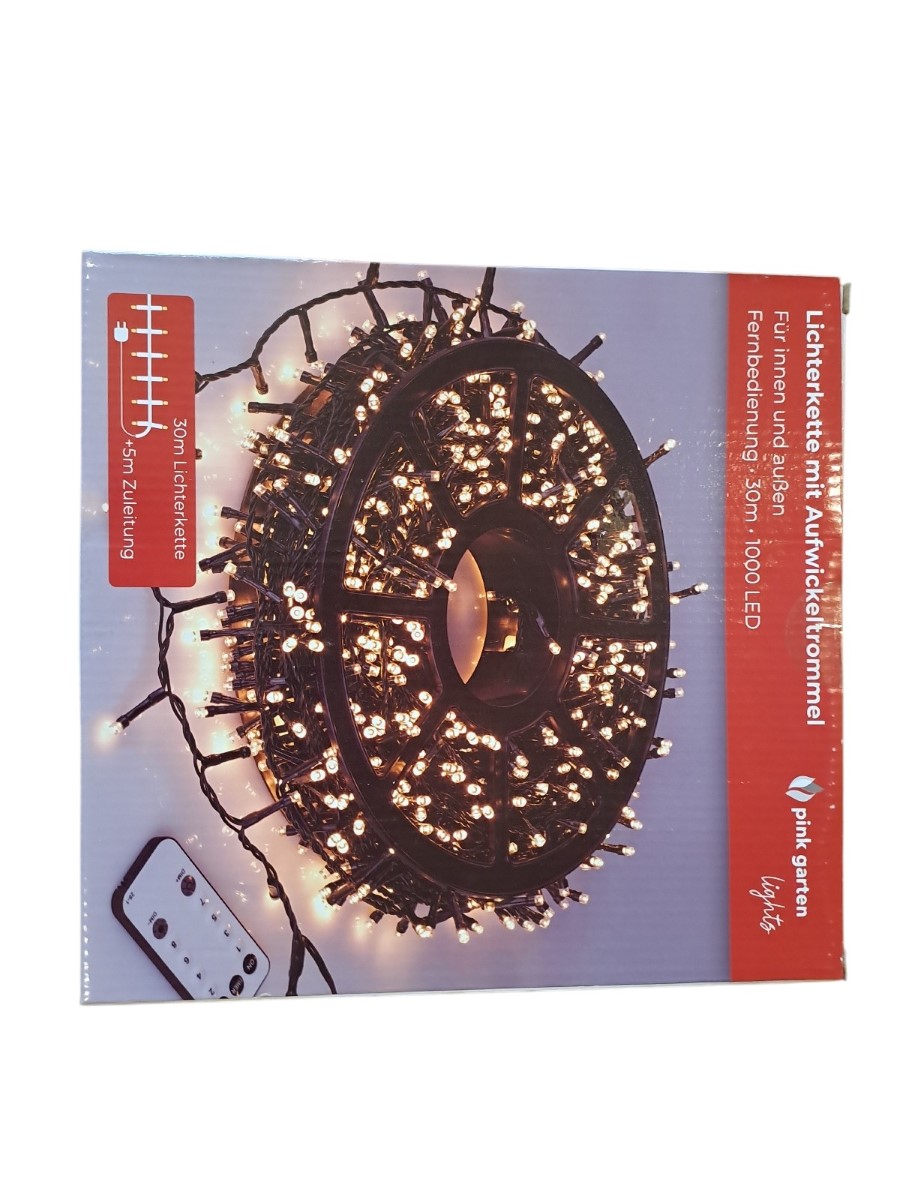 mit Aufwickeltrommel, für innen und außen, mit Fernbedienung, 30 m, 1000 Leds, warm weiß, Neupreis 49,99 Euro, Neuware in OVP