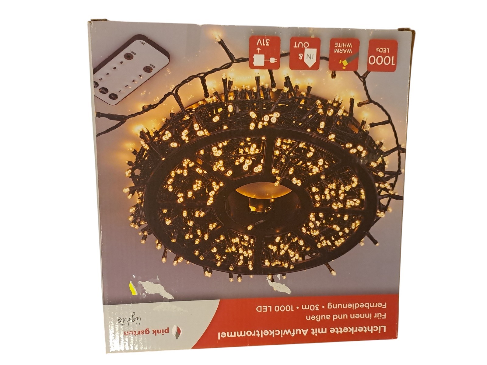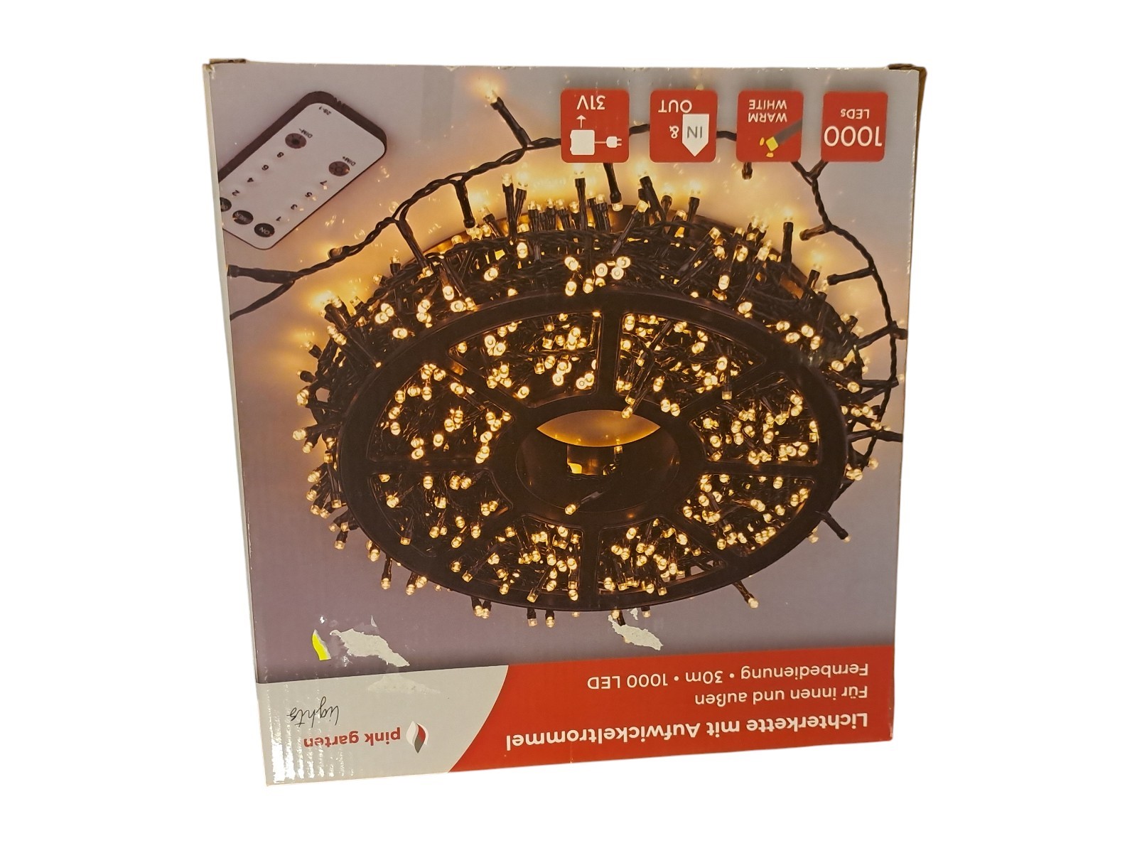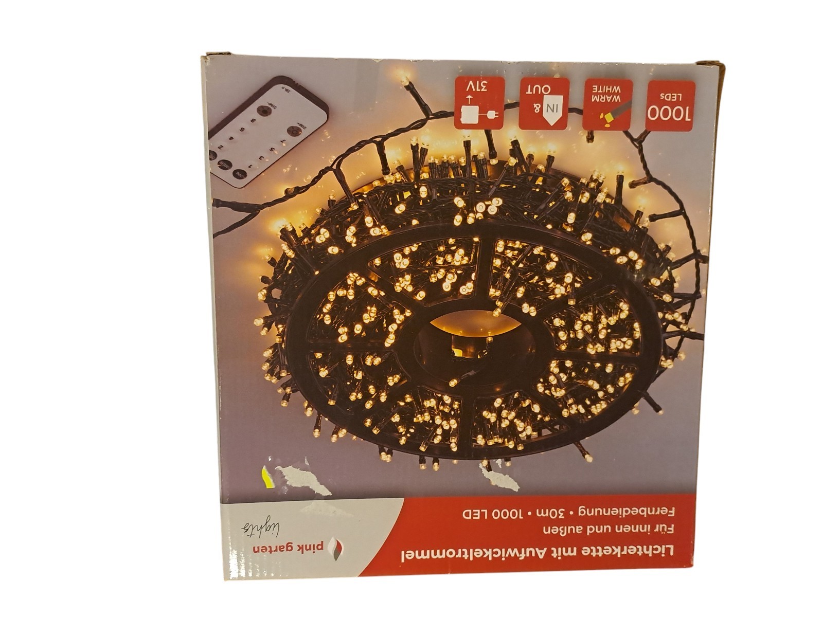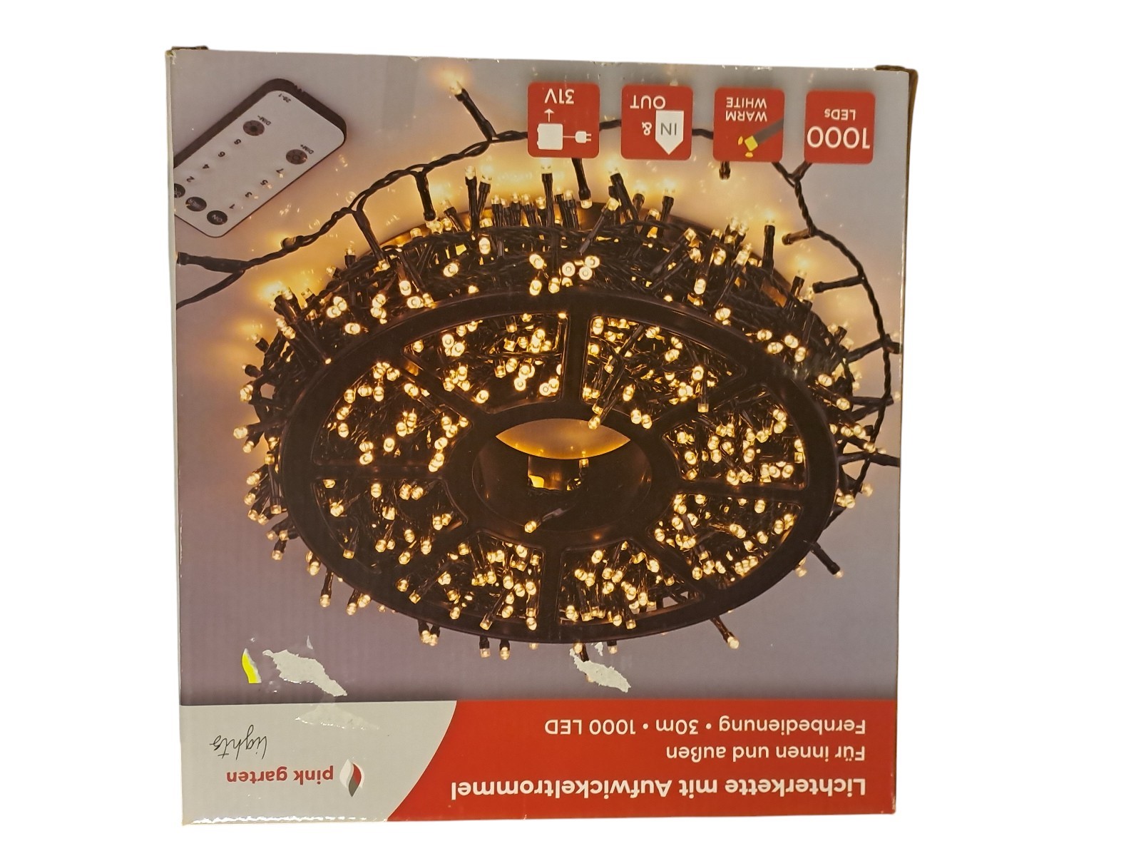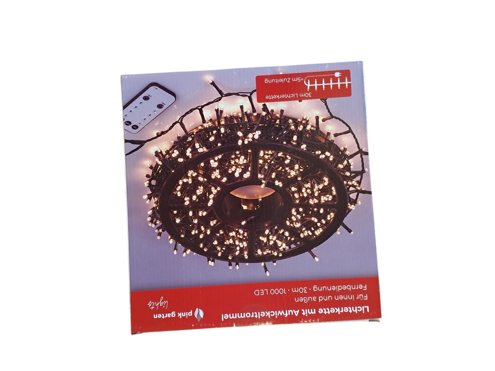 mit Aufwickeltrommel, für innen und außen, mit Fernbedienung, 30 m, 1000 Leds, warm weiß, Neupreis 49,99 Euro, Neuware in OVP