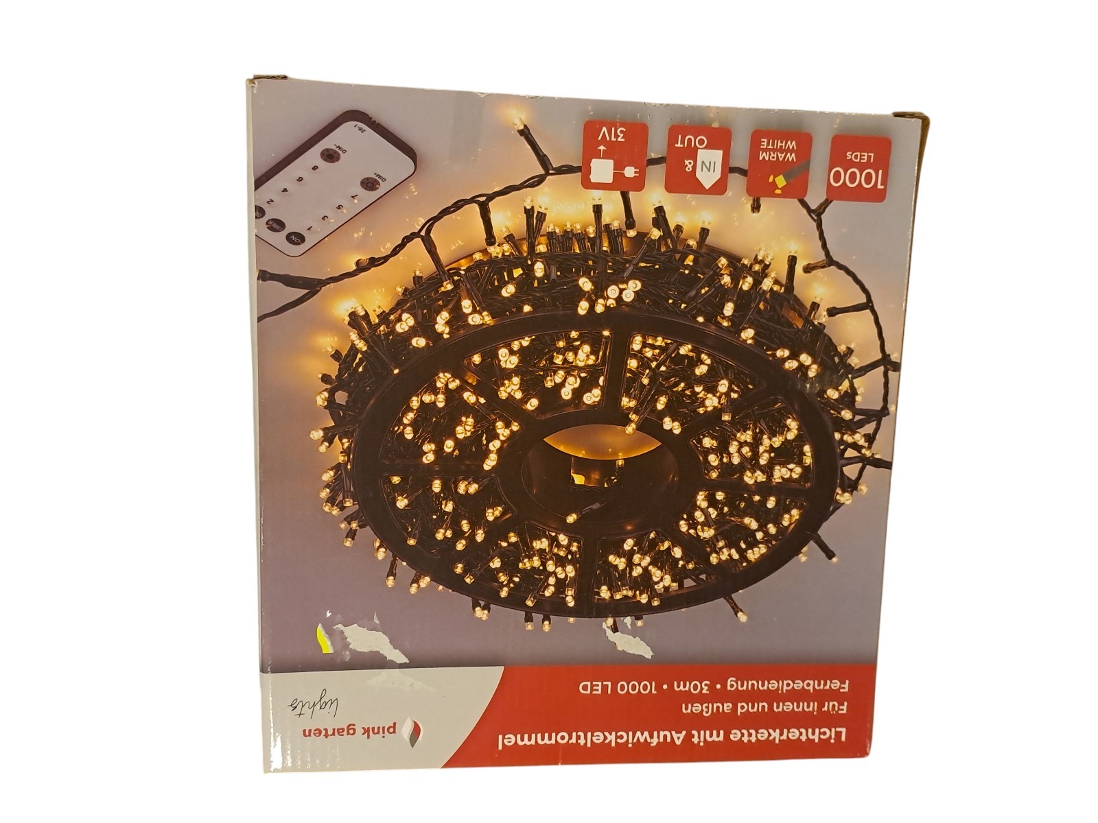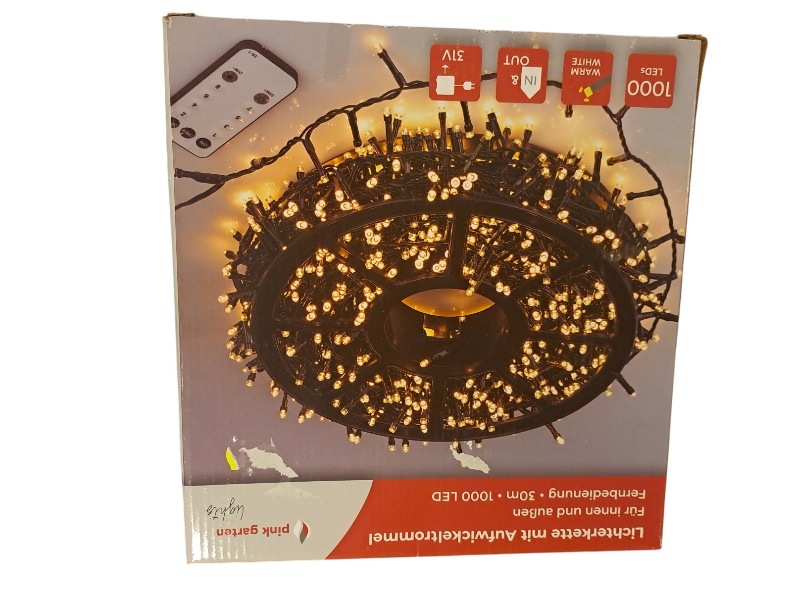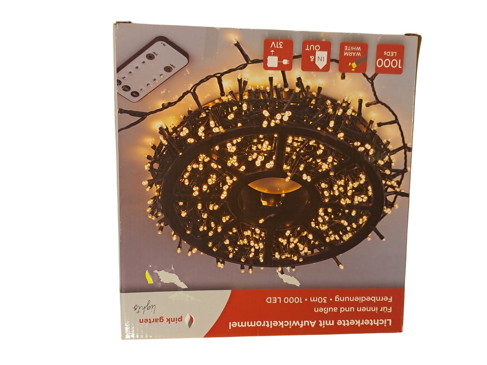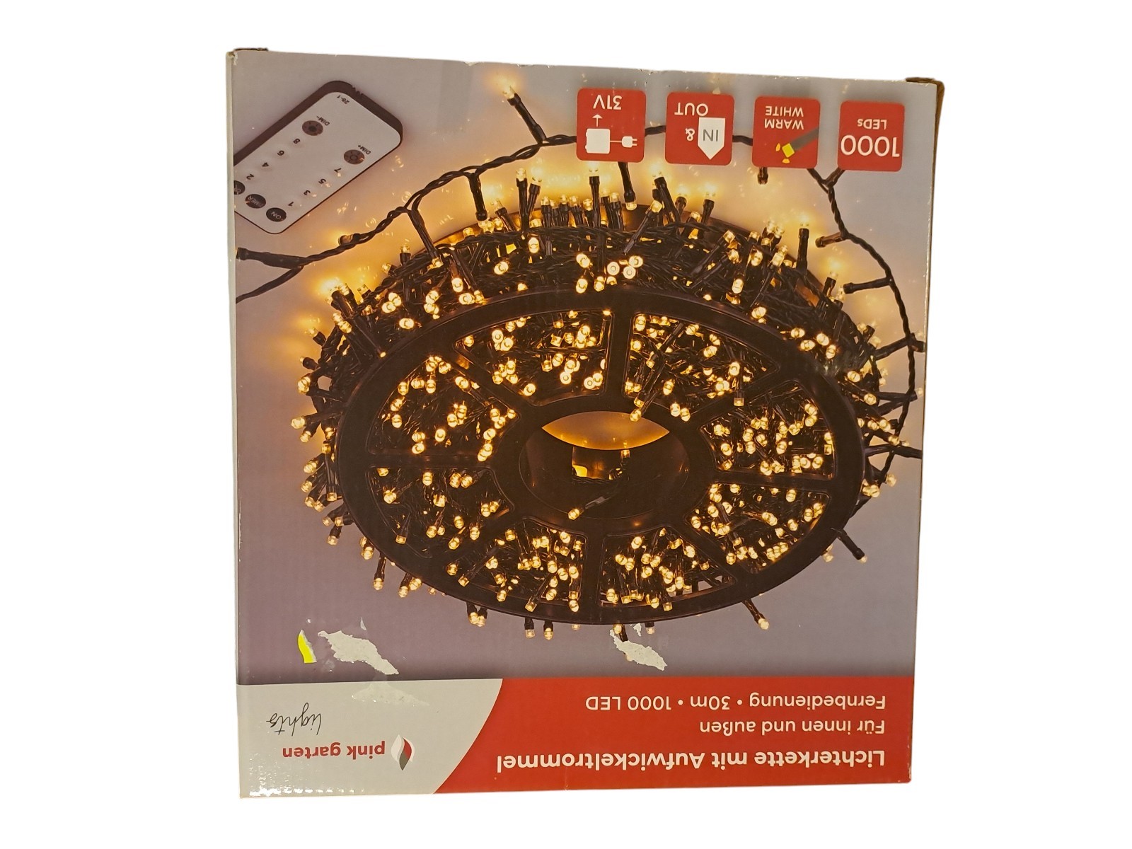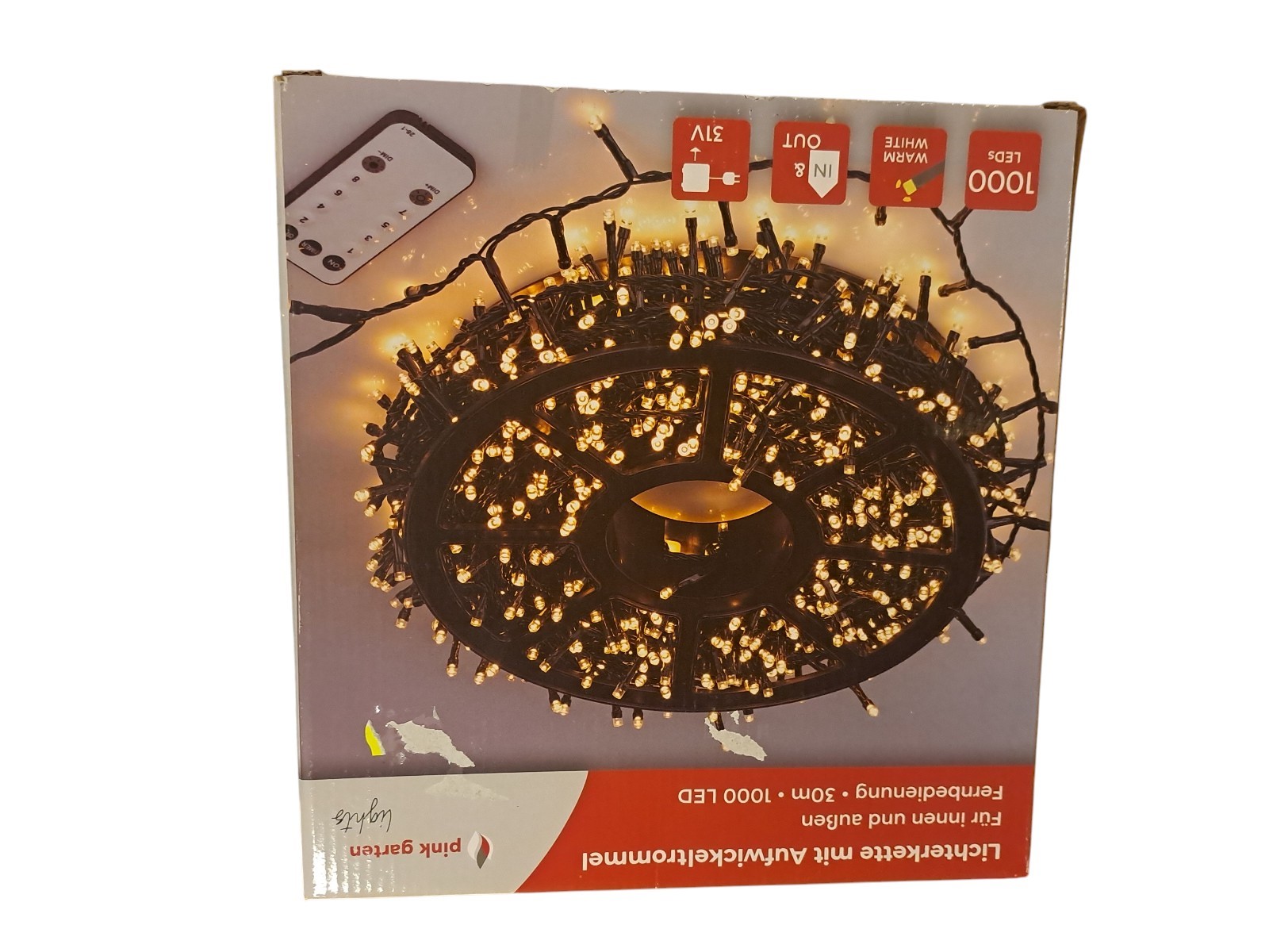 mit Aufwickeltrommel, für innen und außen, mit Fernbedienung, 30 m, 1000 Leds, warm weiß, Neupreis 49,99 Euro, Neuware in OVP