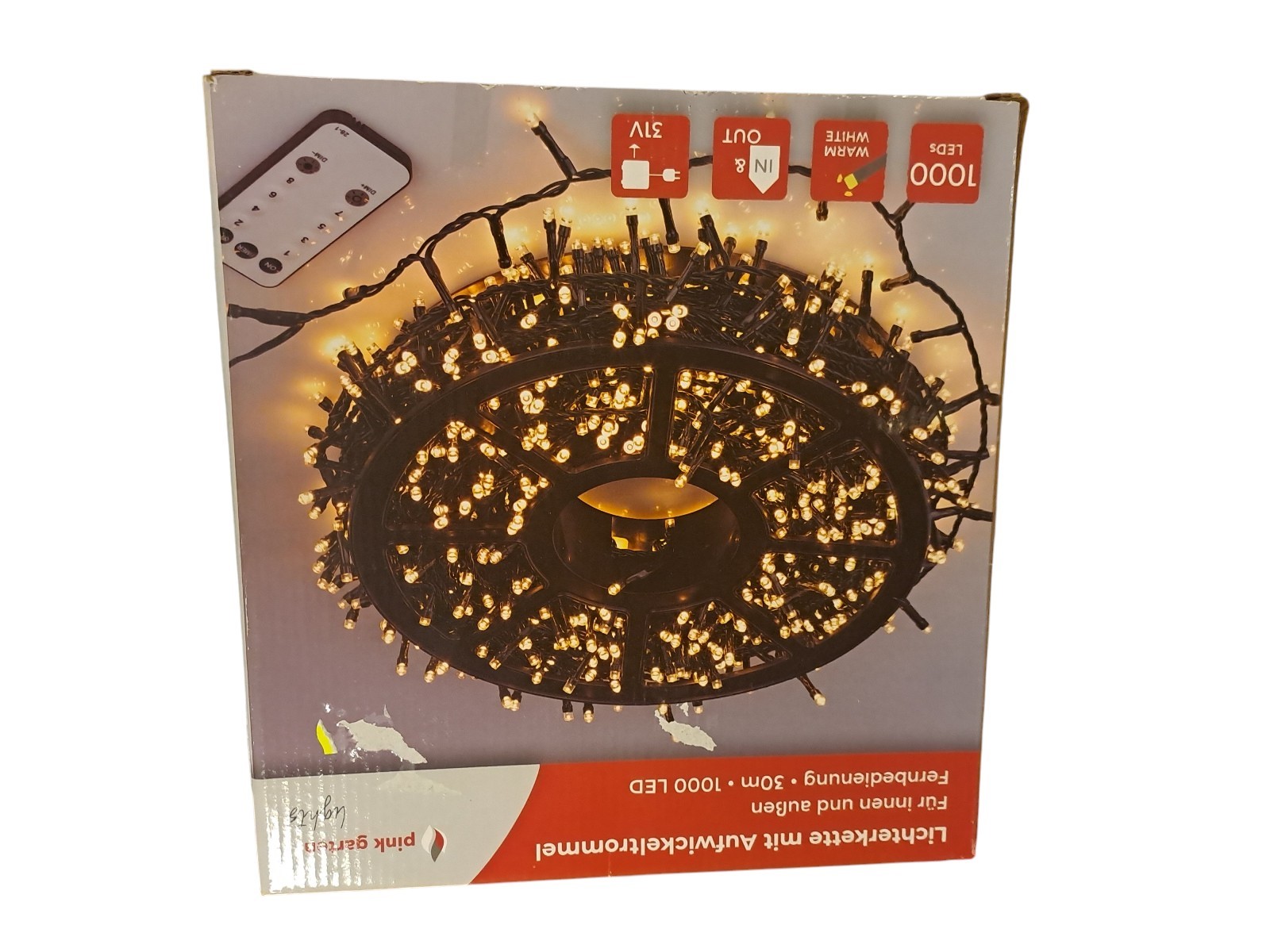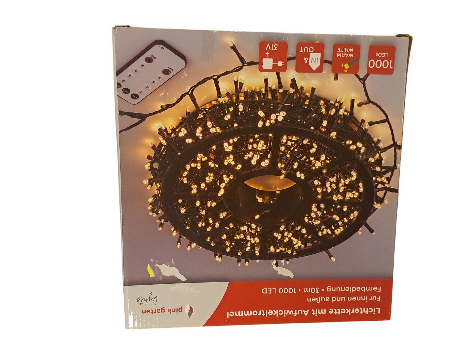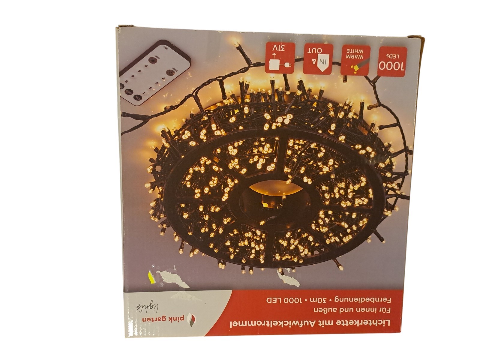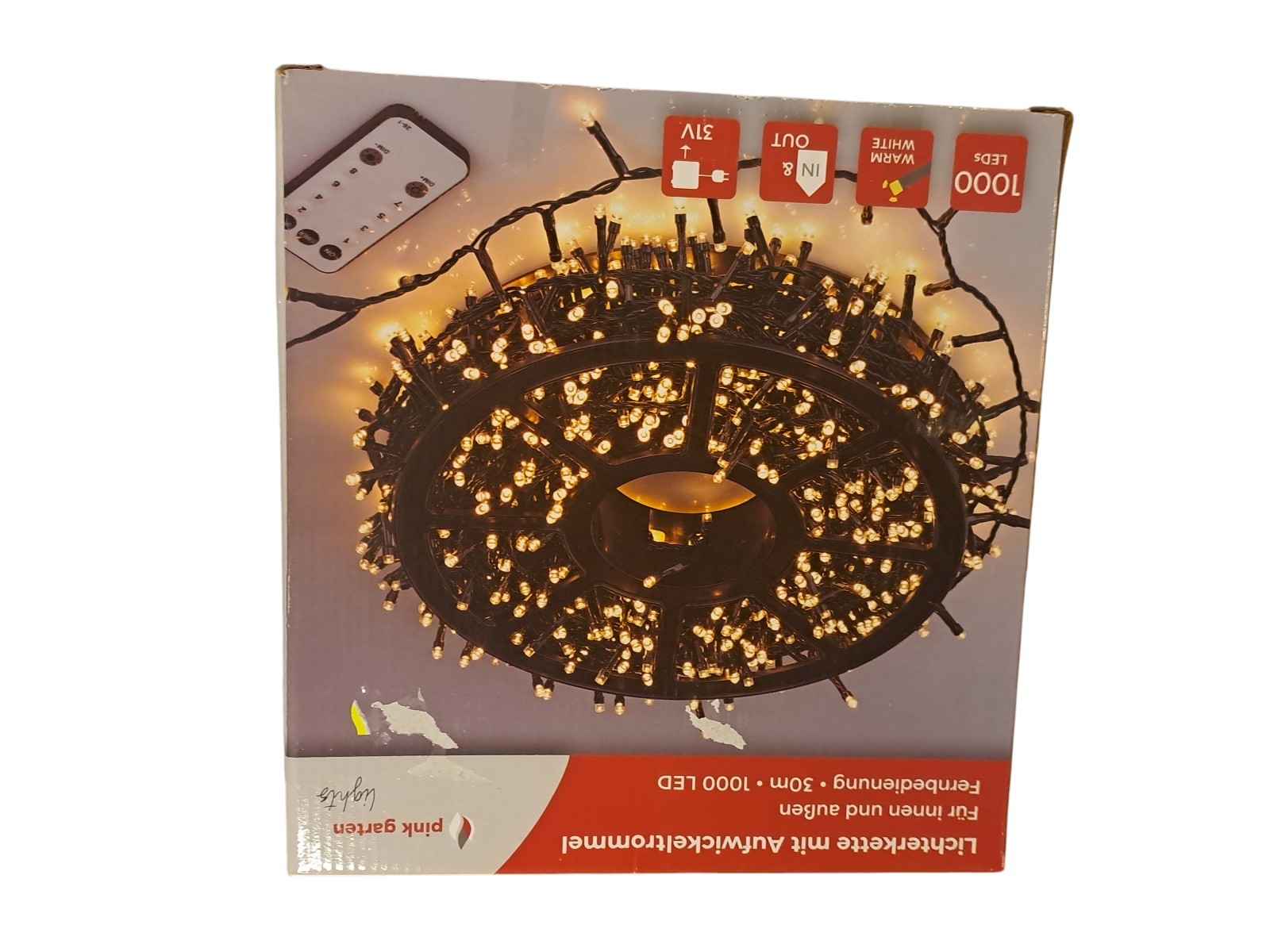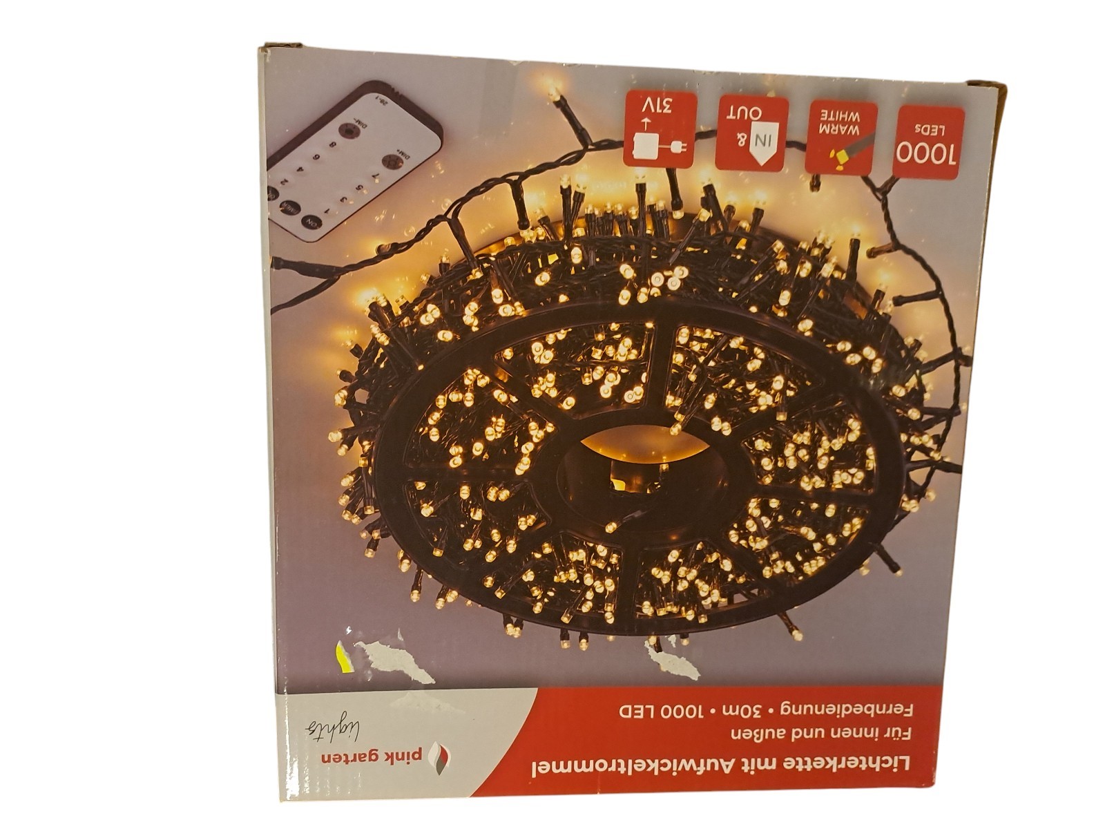 mit Aufwickeltrommel, für innen und außen, mit Fernbedienung, 30 m, 1000 Leds, warm weiß, Neupreis 49,99 Euro, Neuware in OVP