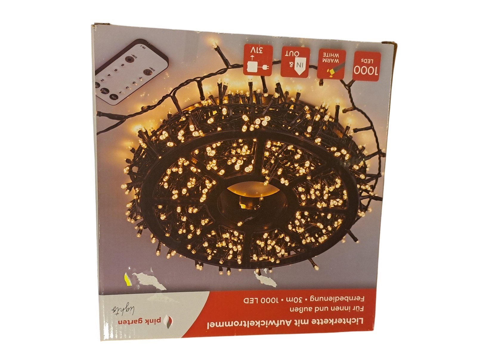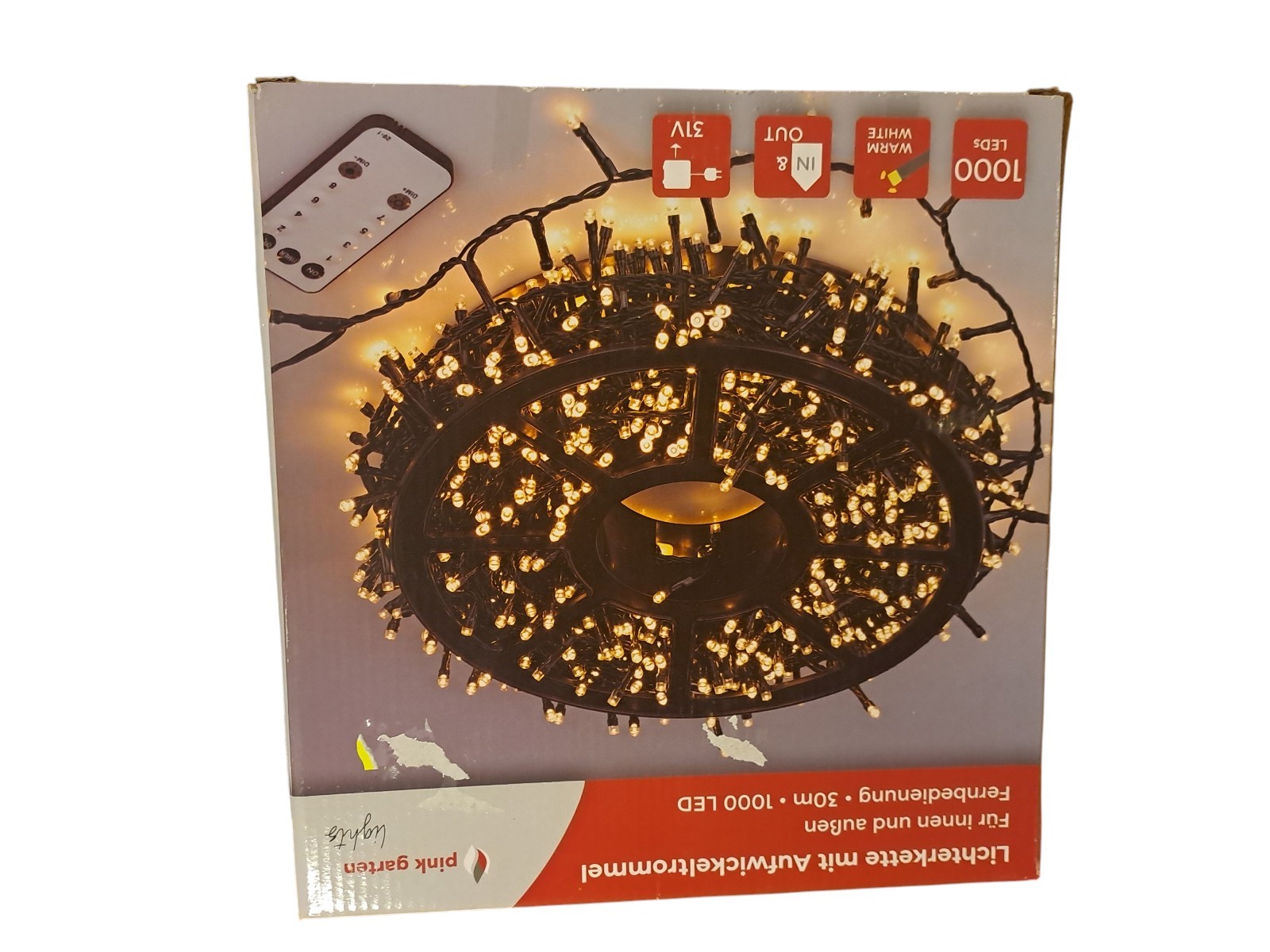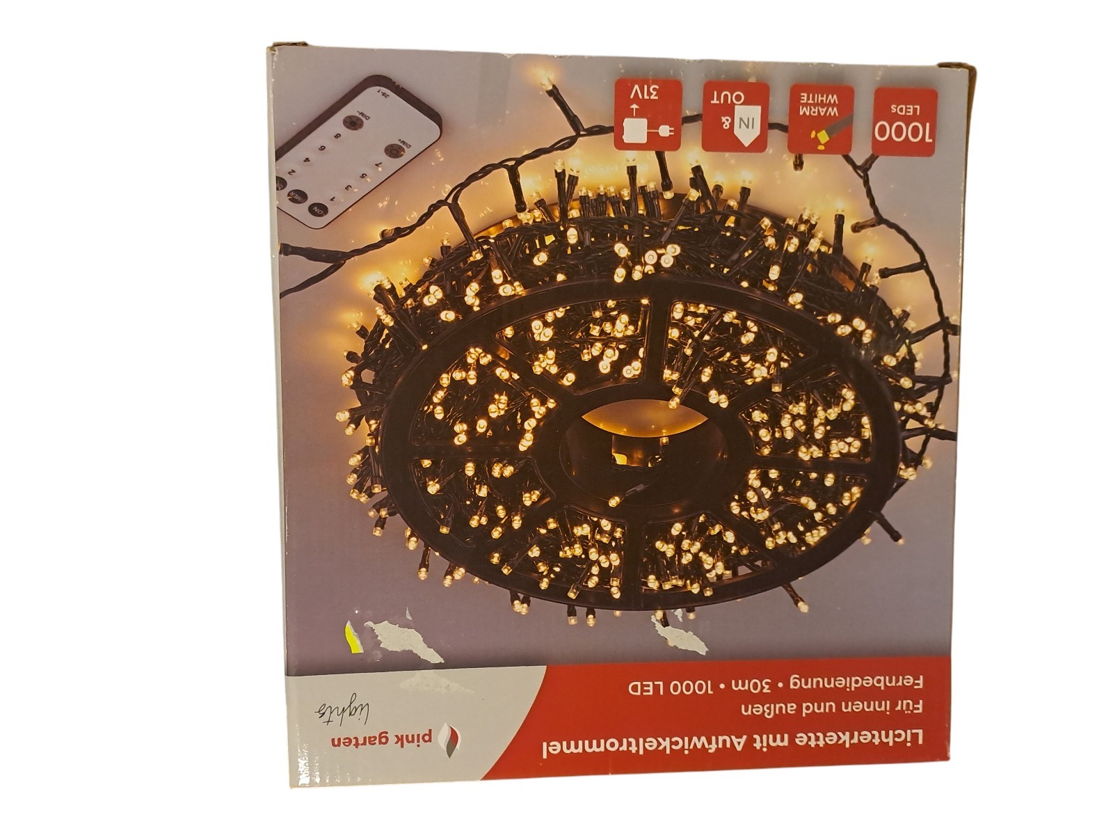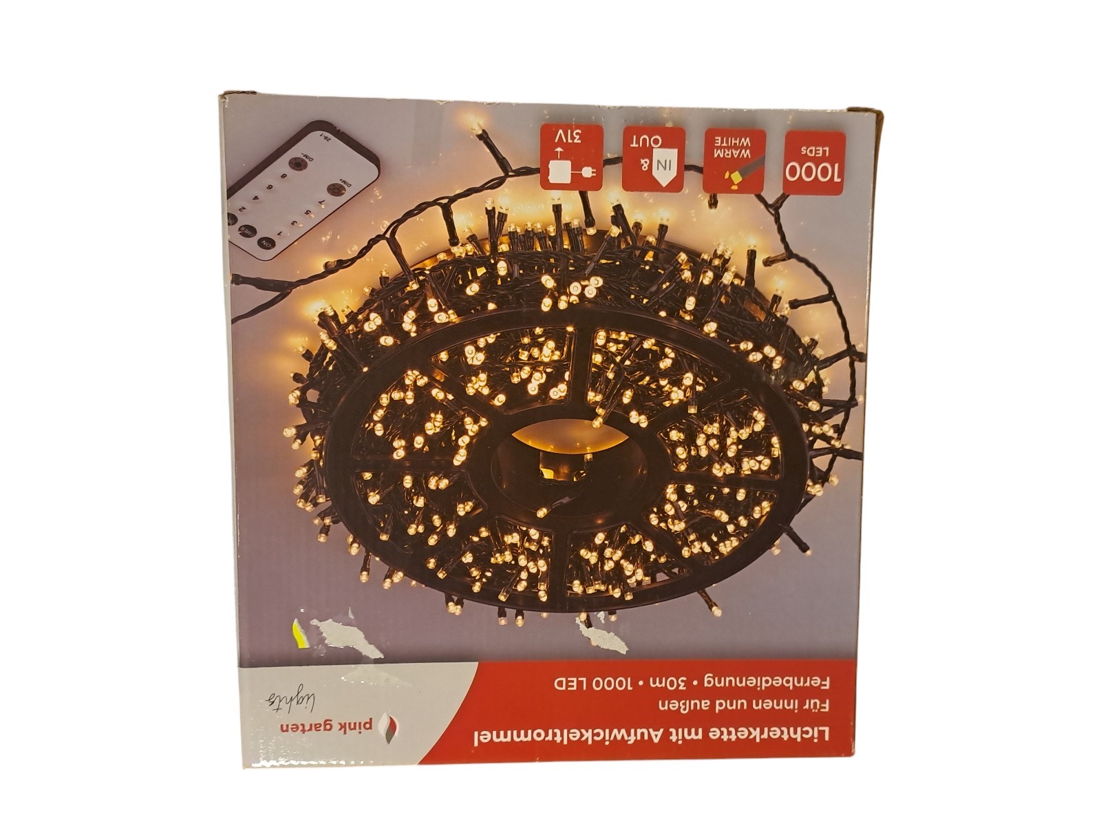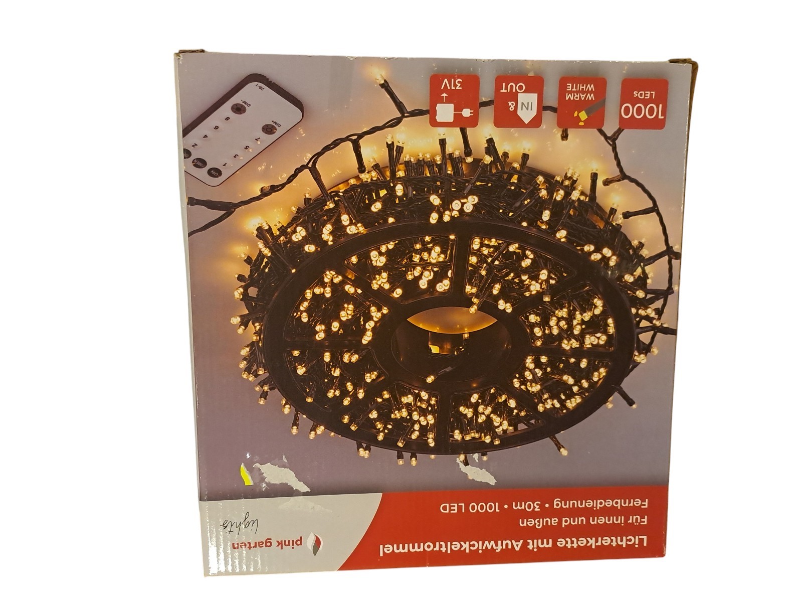 mit Aufwickeltrommel, für innen und außen, mit Fernbedienung, 30 m, 1000 Leds, warm weiß, Neupreis 49,99 Euro, Neuware in OVP