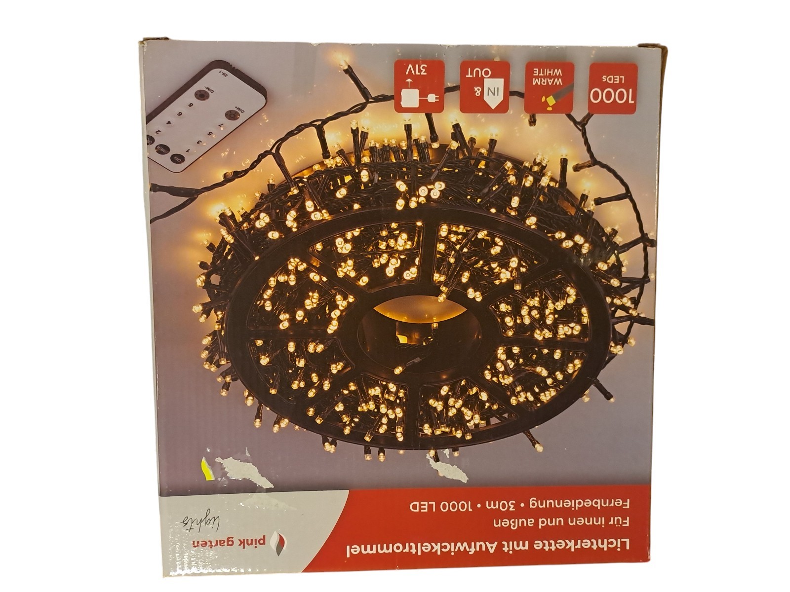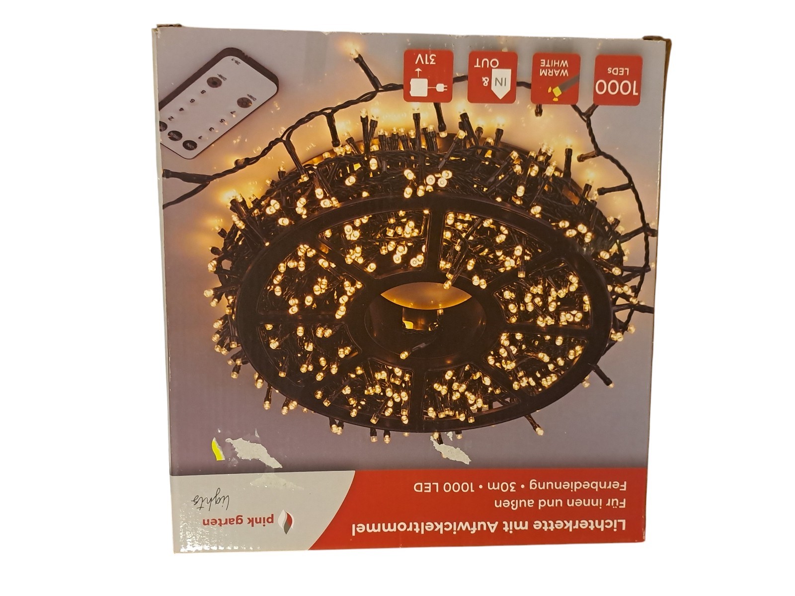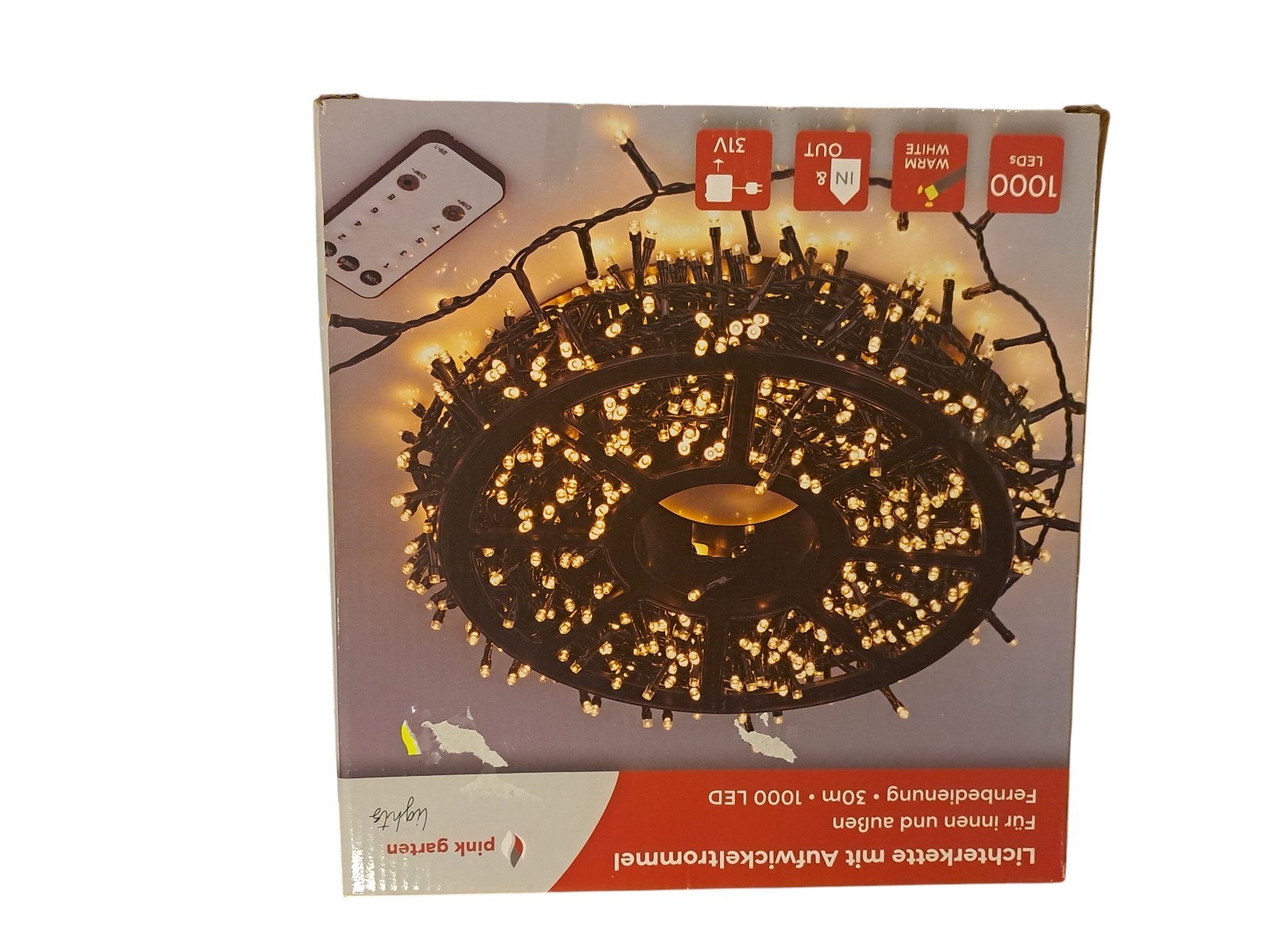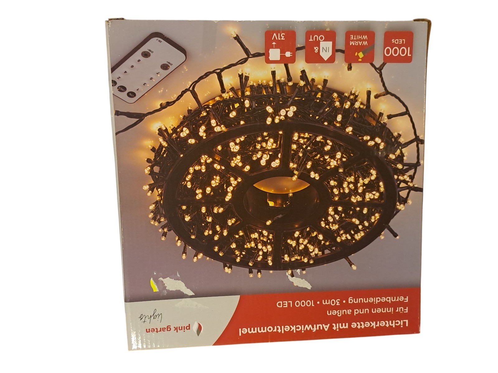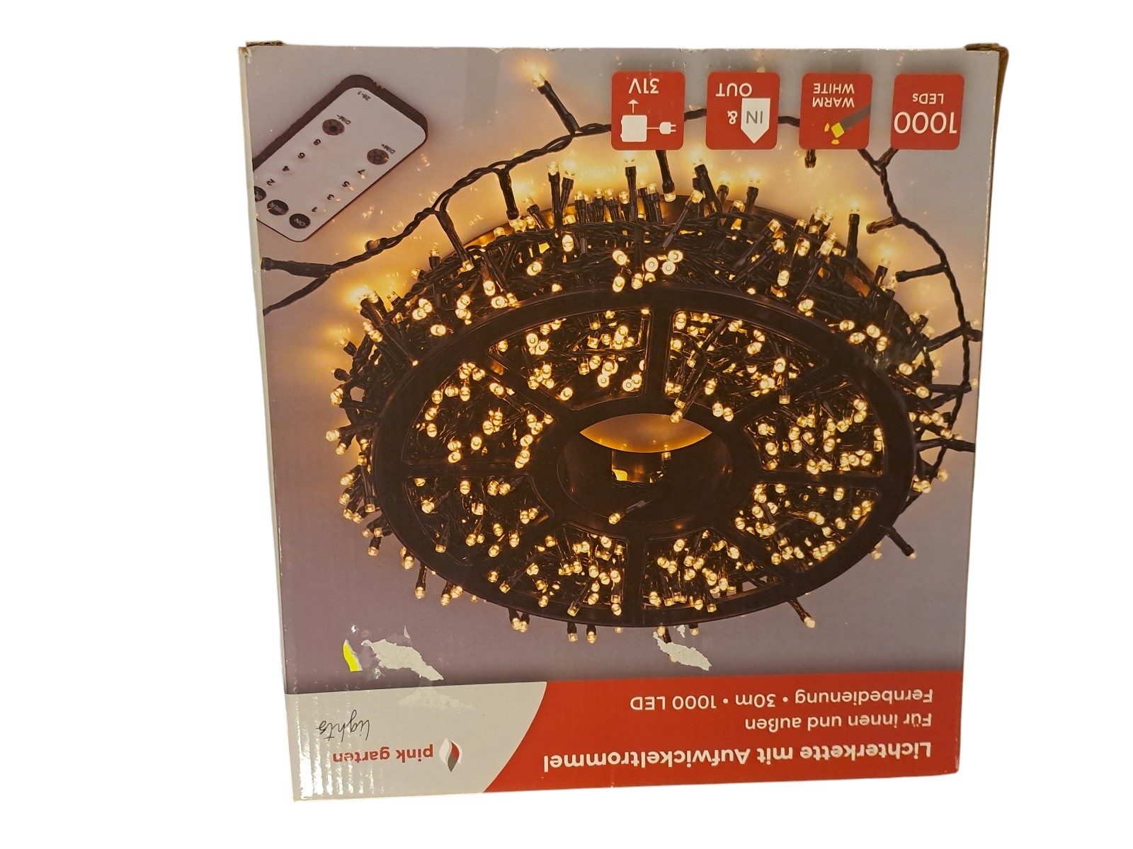 mit Aufwickeltrommel, für innen und außen, mit Fernbedienung, 30 m, 1000 Leds, warm weiß, Neupreis 49,99 Euro, Neuware in OVP