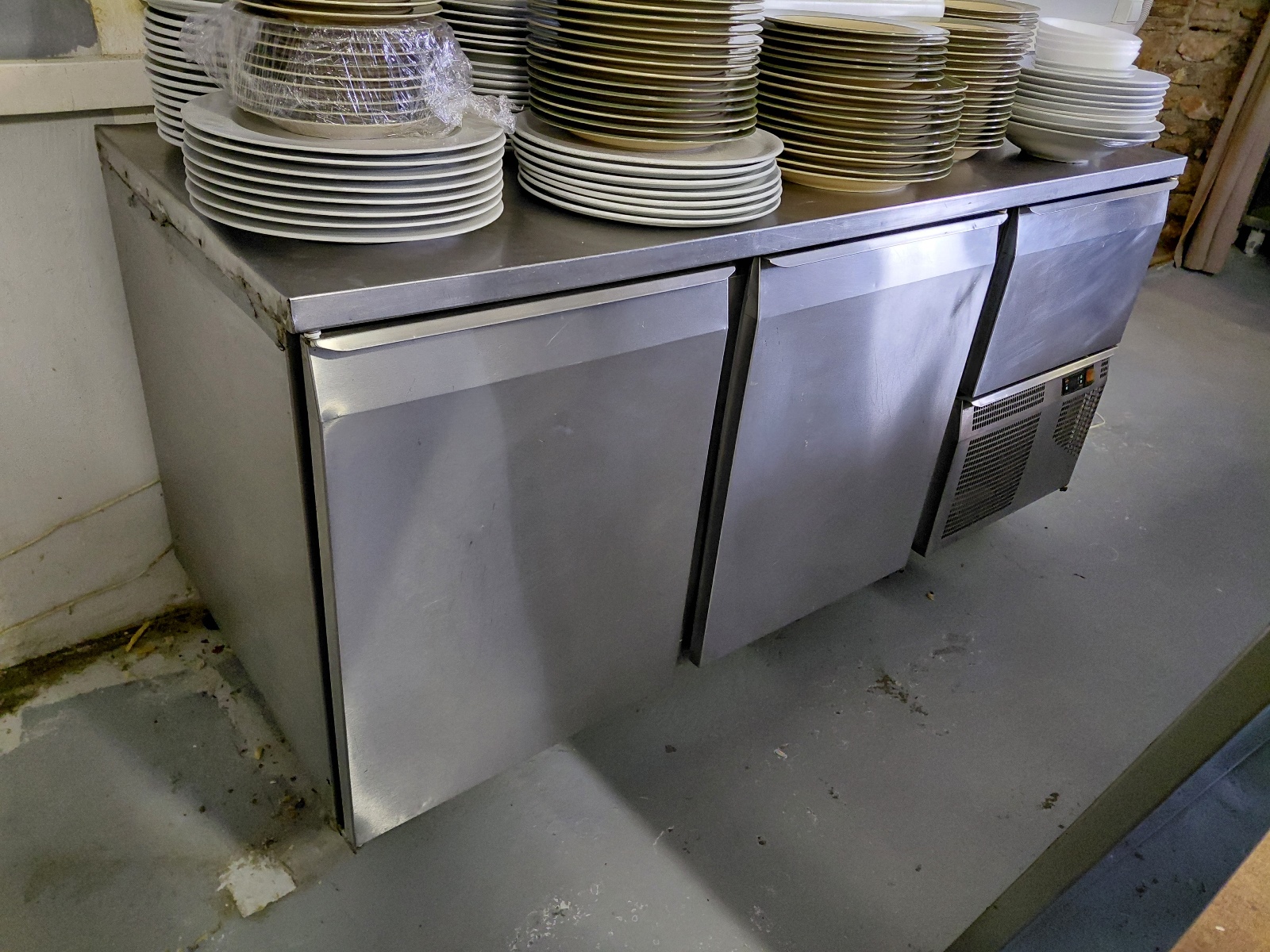 Unterschrank mit Arbeitsplatte in Granitoptik, BHT ca. 216x90x82 cm, inkl. Kühlvitrine BHT ca. 140x43x34 cm oberhalb, keine Gewähr auf Funktion, Beschädigungen, ohne Geschirr, Abbau ab 10 Uhr