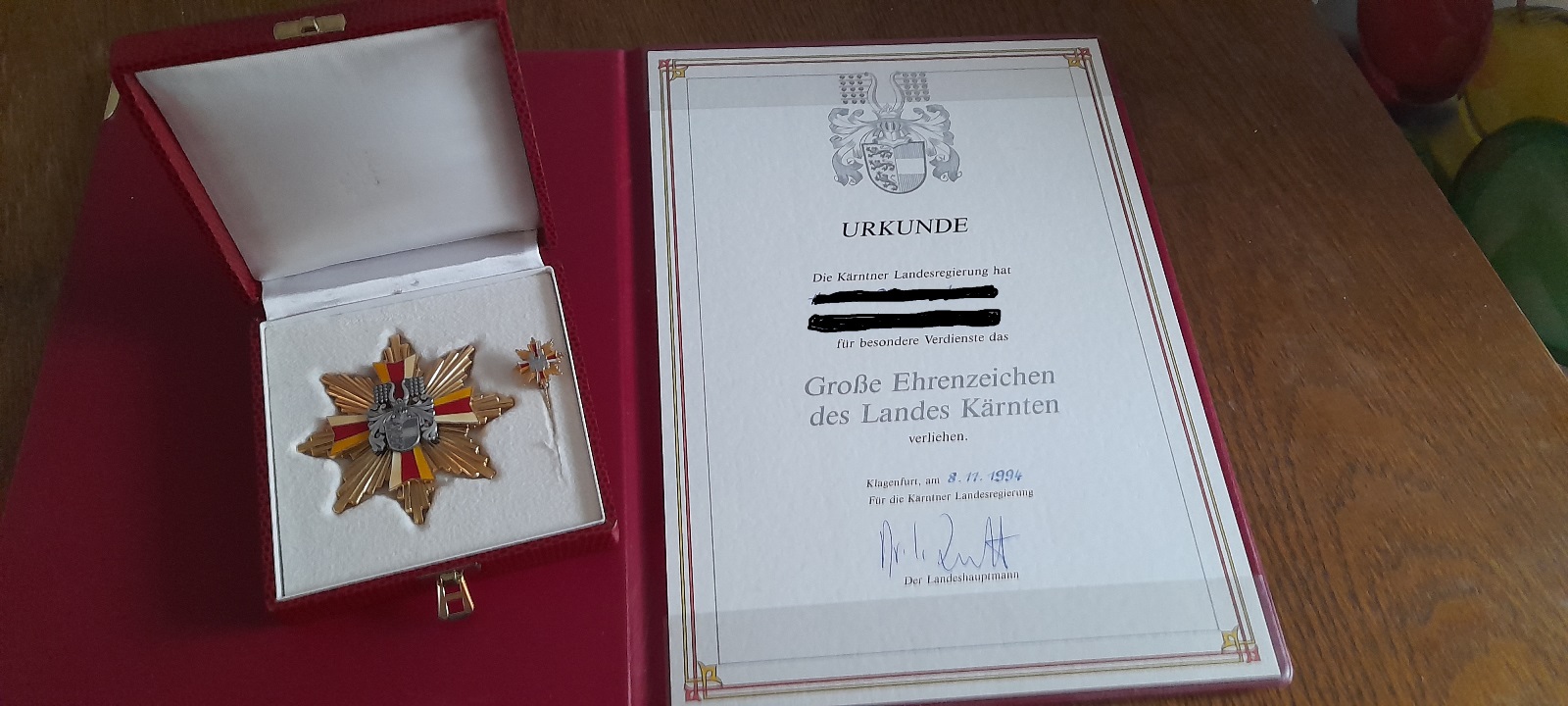Großes Ehrenzeichen des Landes Kärnten und Anstecknadel im Etui mit Verleihungsurkunde