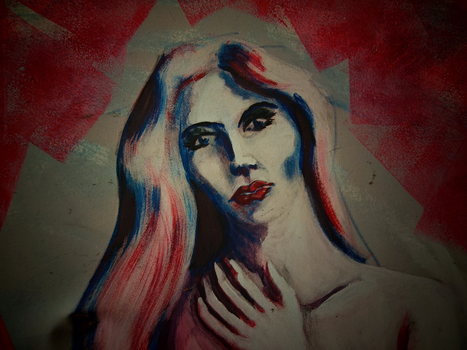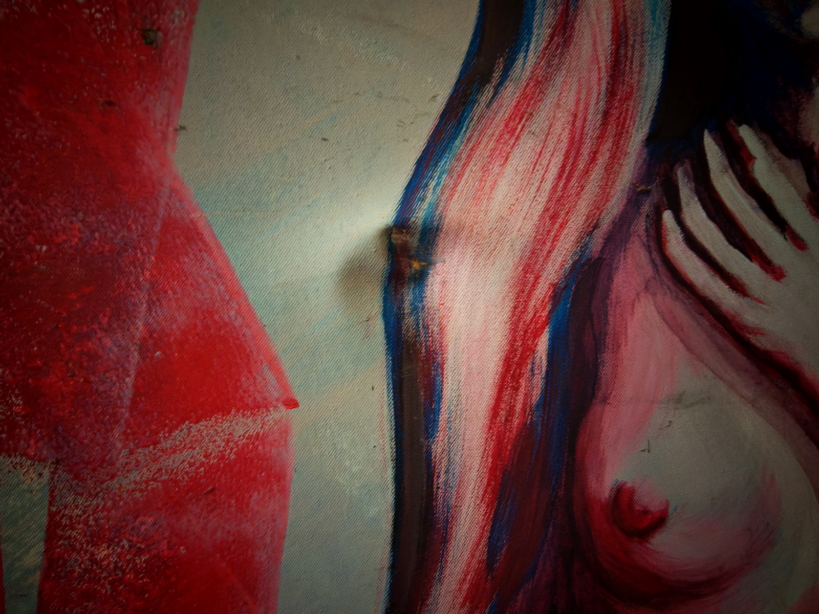 Acryl auf Leinen, ca. 130×200 cm, auf Spannrahmen, Leinen an mehreren Stellen überdehnt, verschmutzt, siehe Fotos