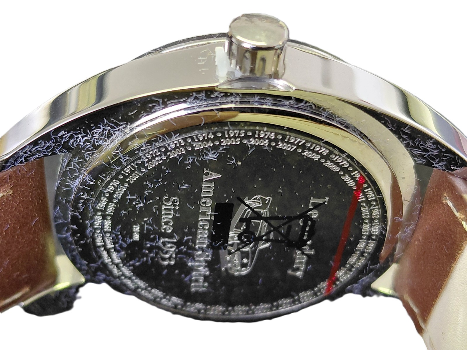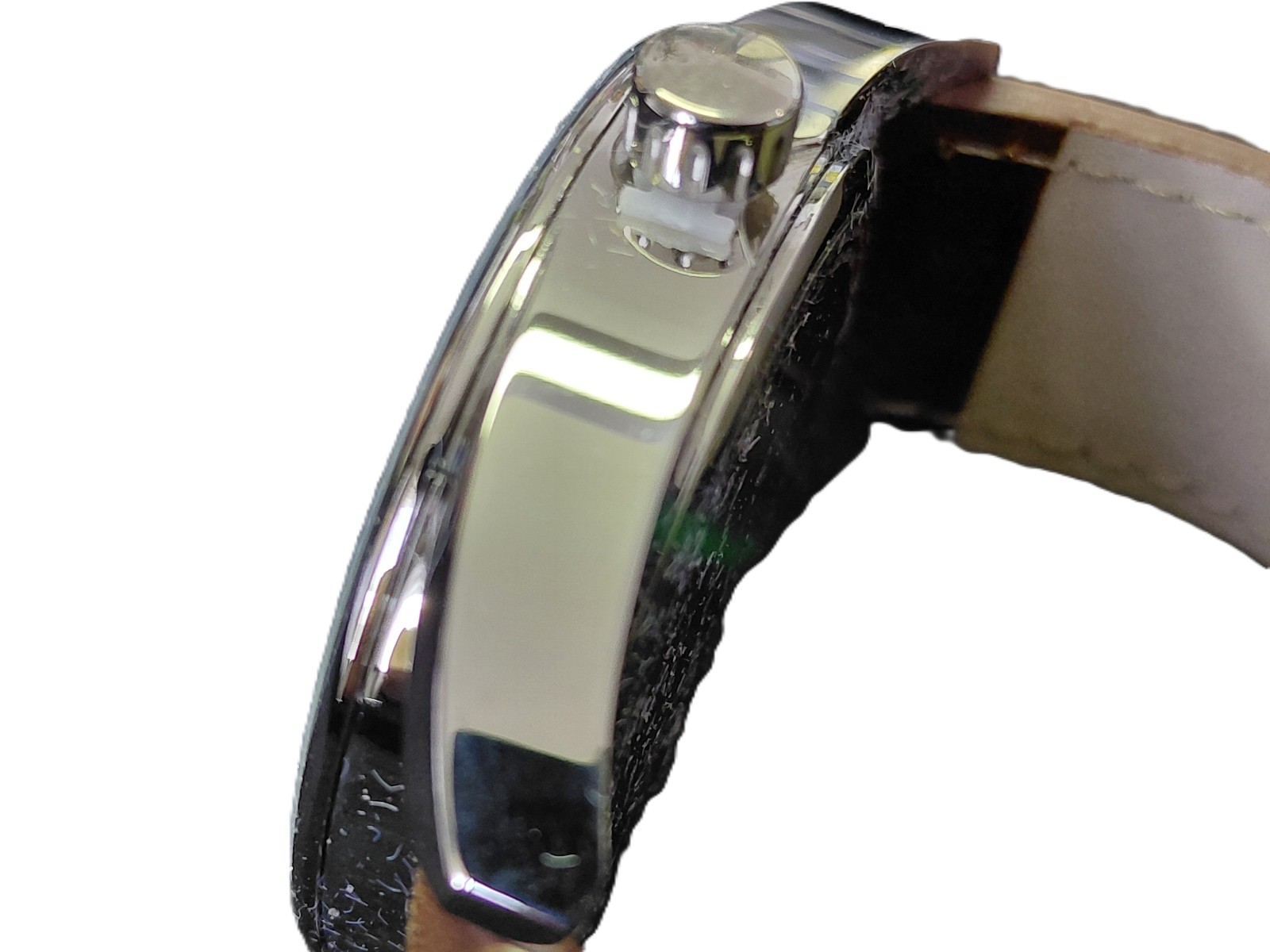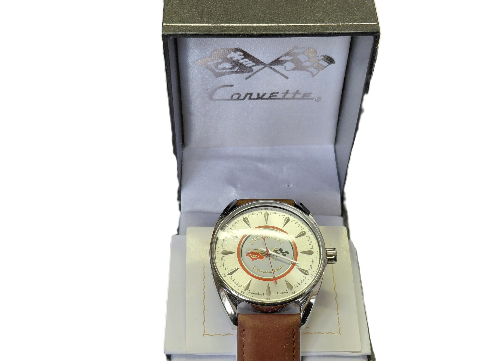 Quartzwerk, Batteriezustand ungewiss, allerdings ungetragen und mit Kronenschutz, Lederband mit Metalldornschließe, in Etui