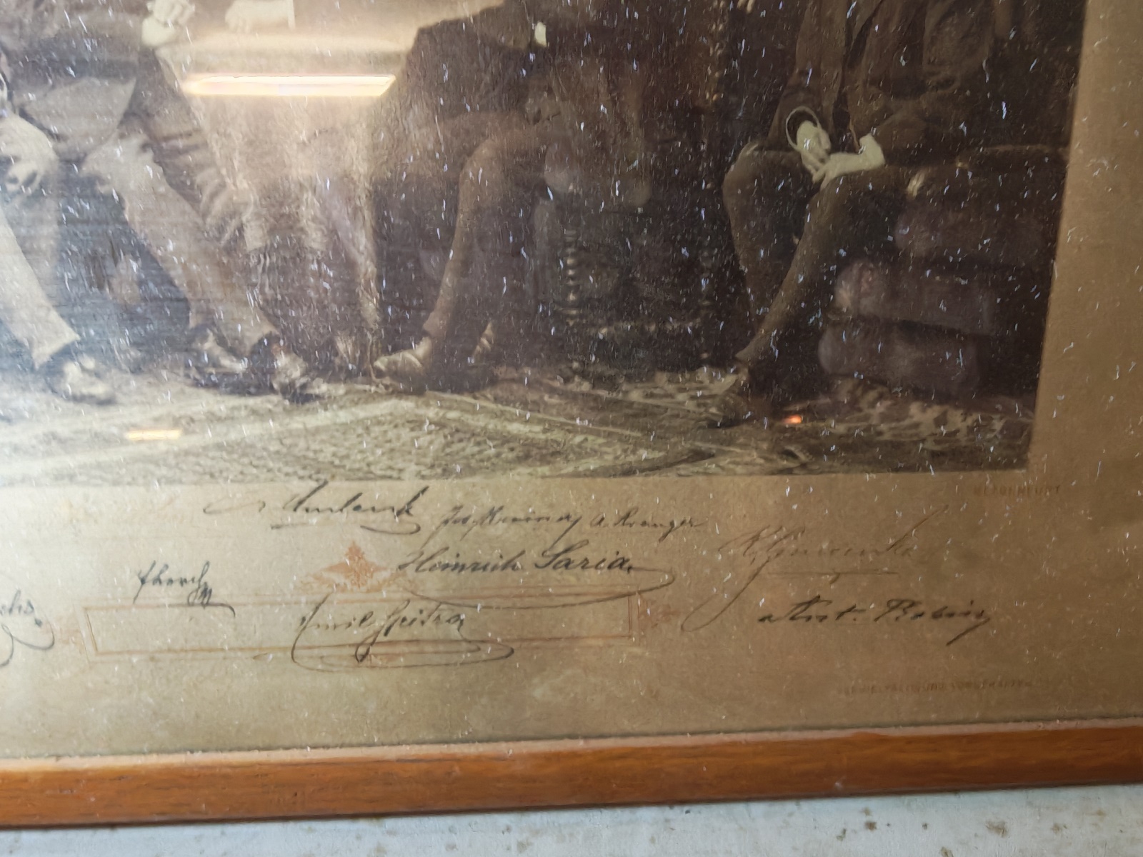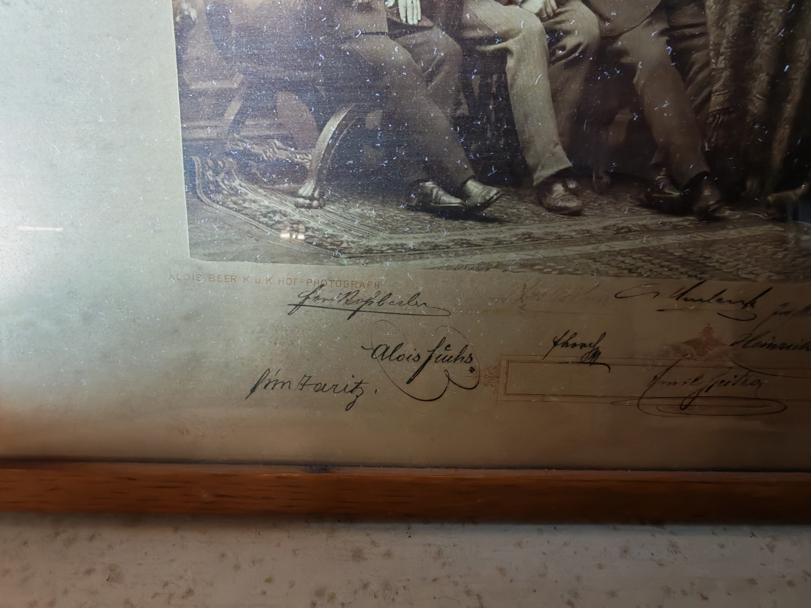 dargestellt sind die Mitglieder des österreichischen Alpenvereines, Sektion Klagenfurt um das Jahr 1894, darunter die Klagenfurter Kaufmänner Heinrich Saria, Emil Spitra, Alois Fuchs, Simon Jaritz und weitere, mit Signaturen, gerahmt, verglast, ca. 43×33 cm