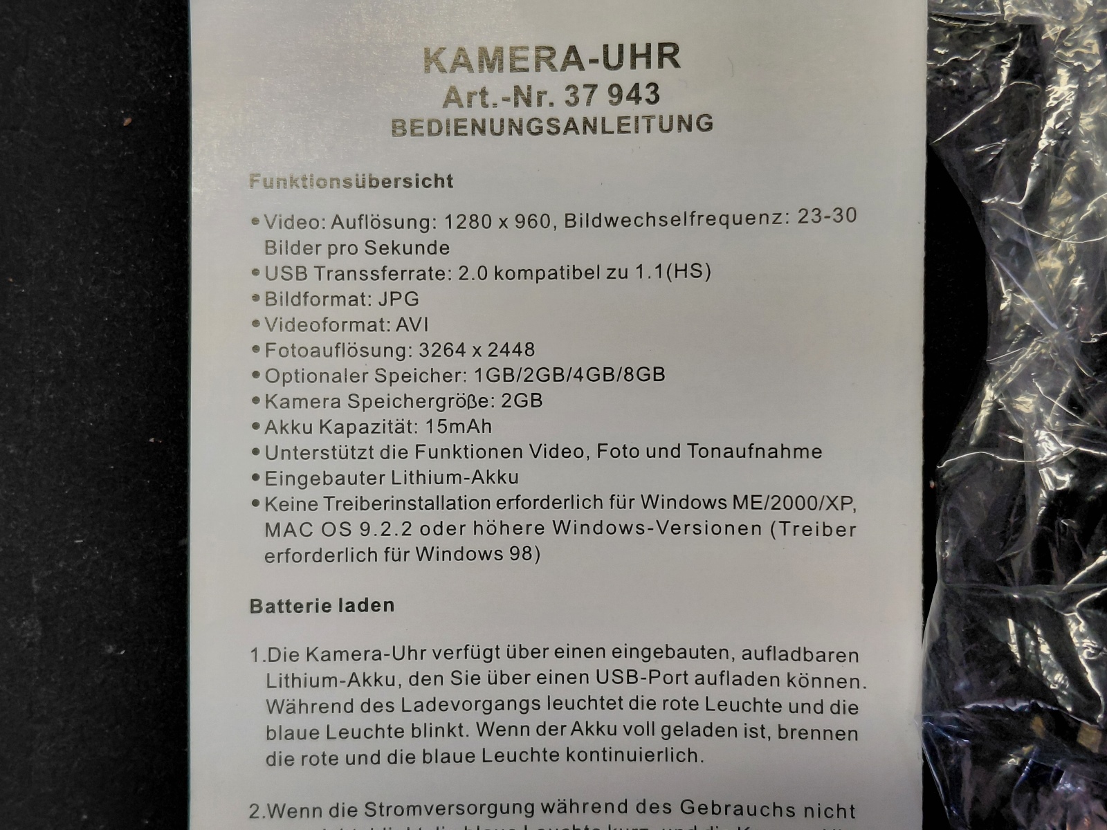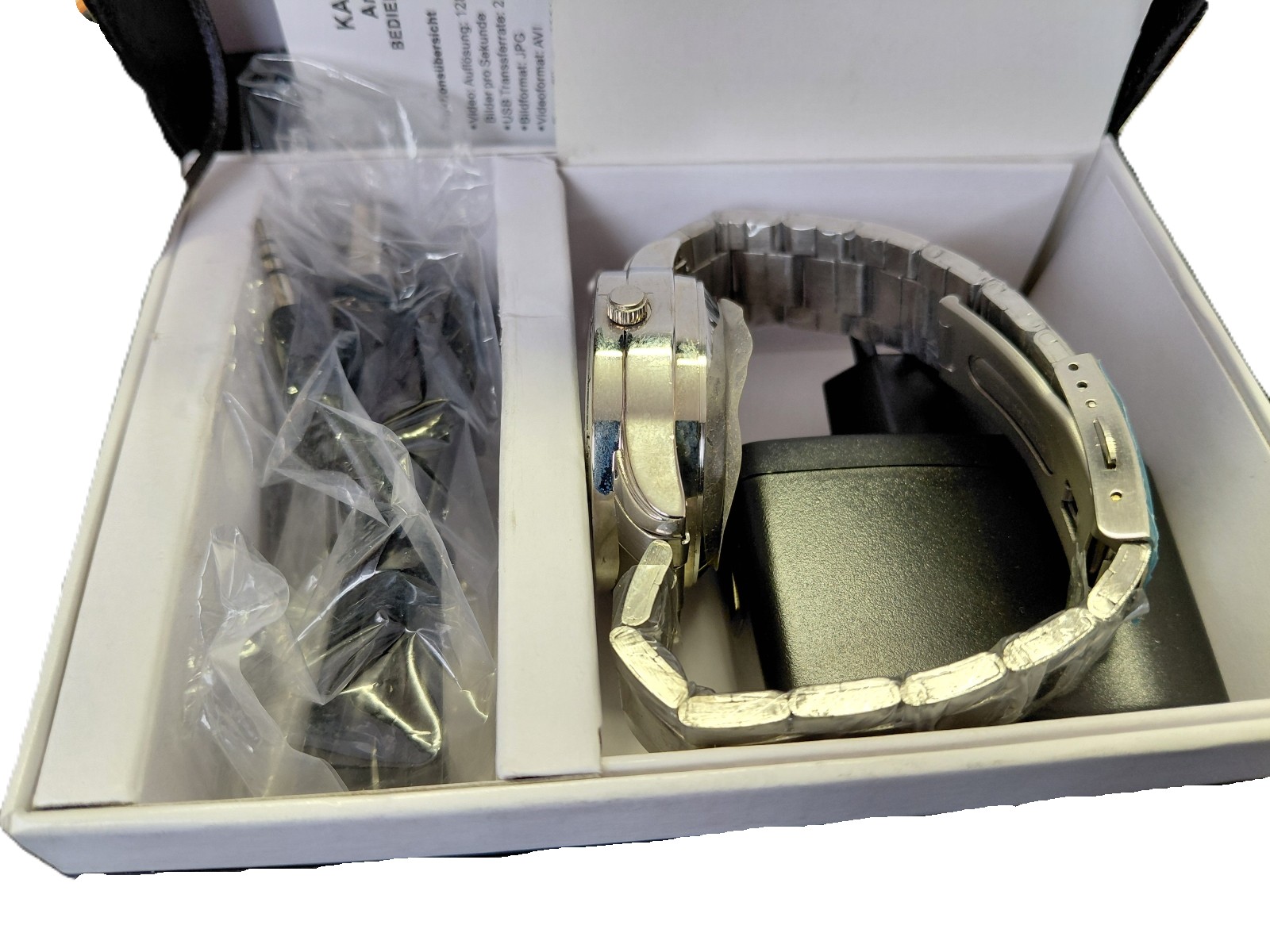 Armbanduhr mit eingebauter Kamera mit 2 GB Datenspeicher, Videoauflösung 1280×960, Fotoauflösung 3264×2448, eingebauter Lithiumakku, inkl. Ladegerät und Beschreibung, in Etui