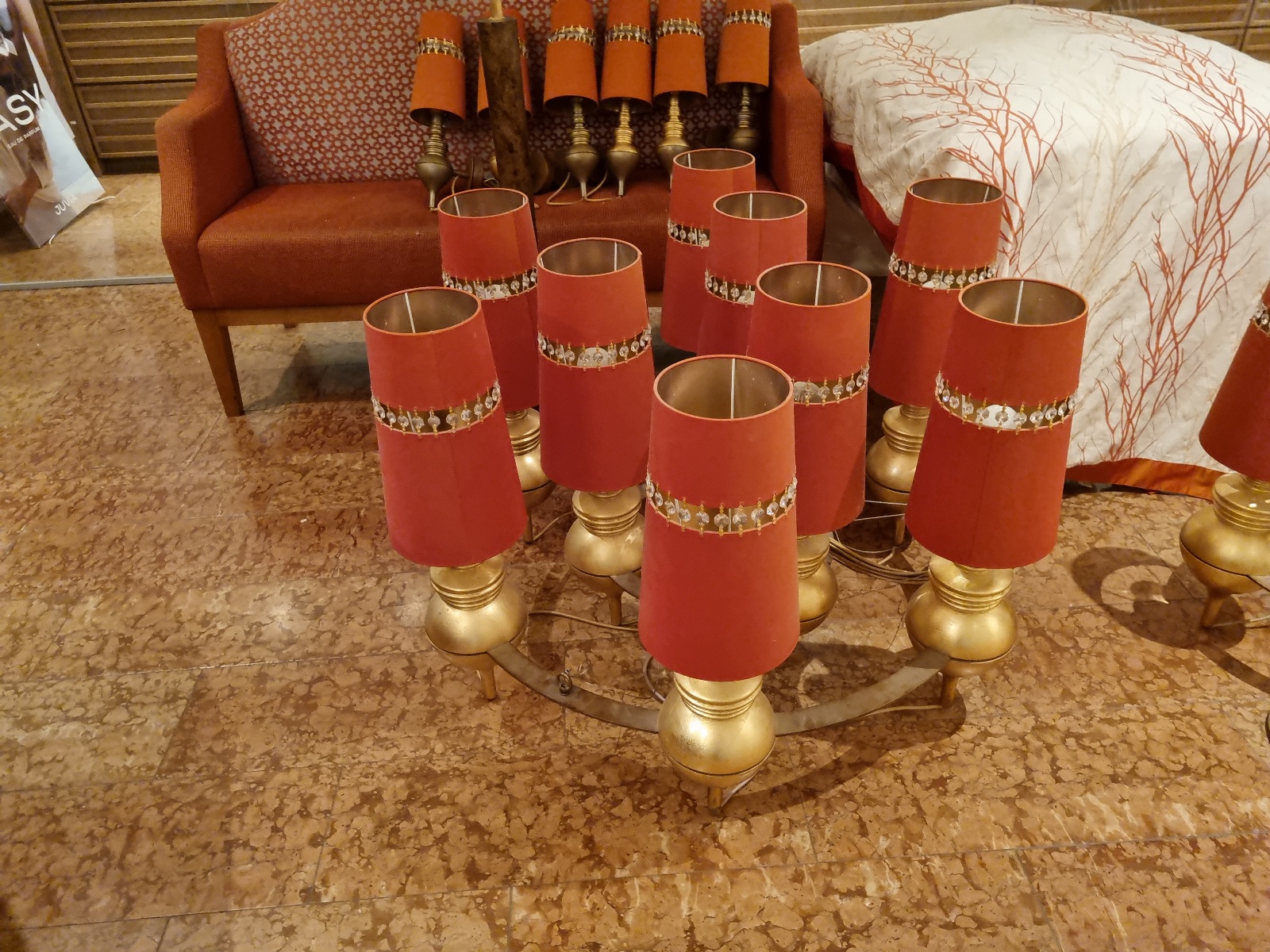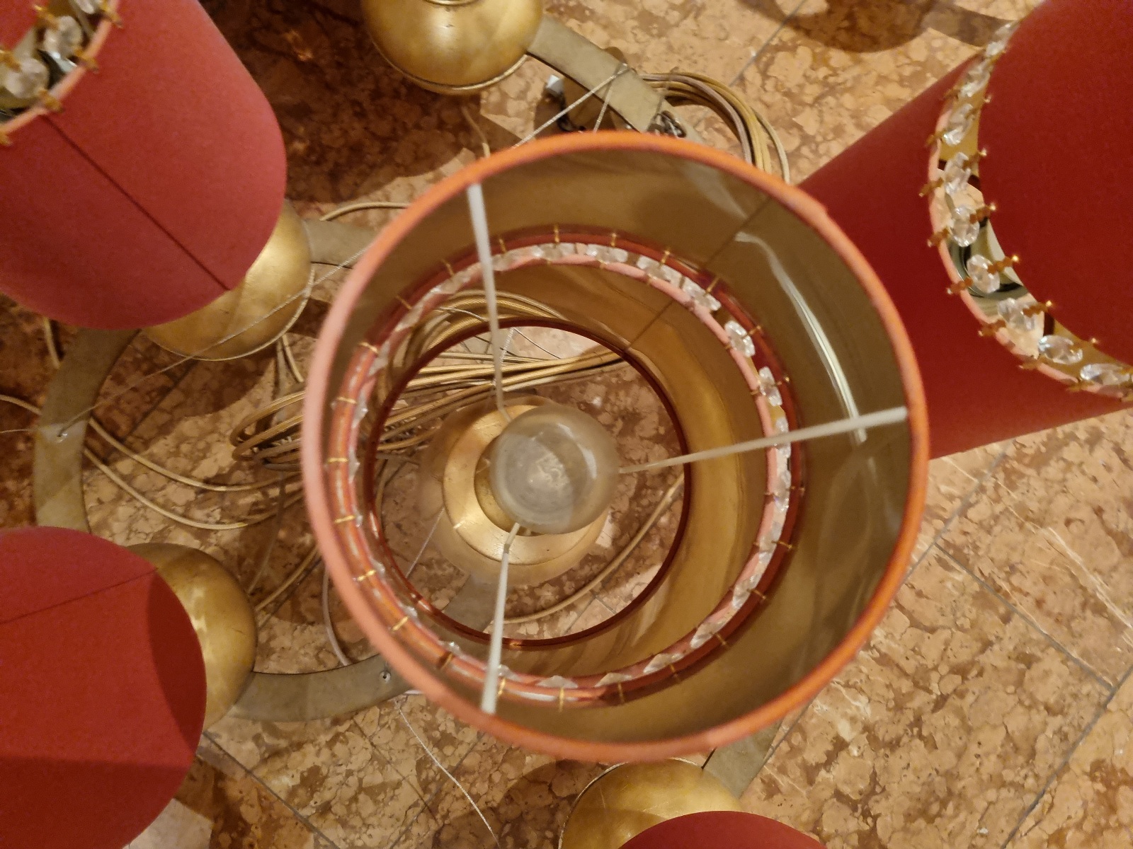 9-flammig, Metall/ Holz, DMxH ca. 110×75 cm, Metallring , bereits abgebaut, siehe Fotos