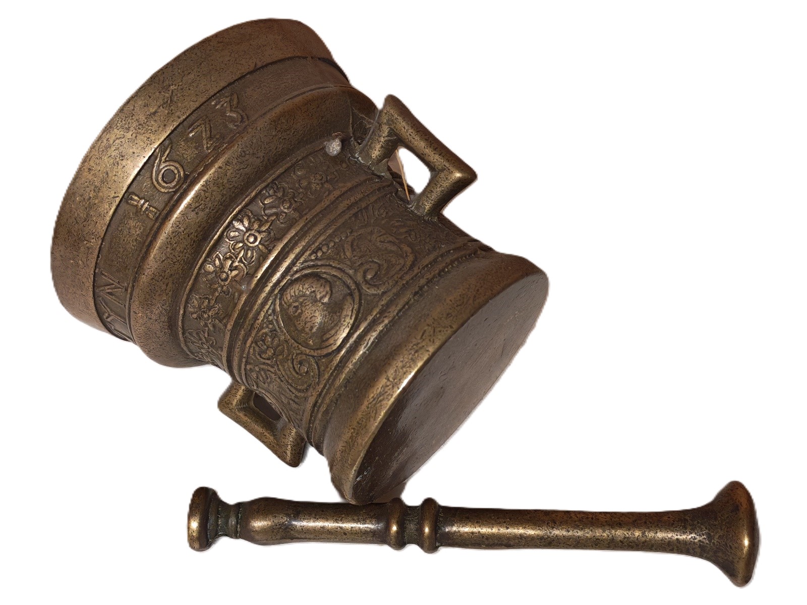 Rundumlaufende reiche inguß-Verzierung mit Richard Startyn 1623, DMxH ca. 13×12 cm, Stößellänge ca. 18 cm