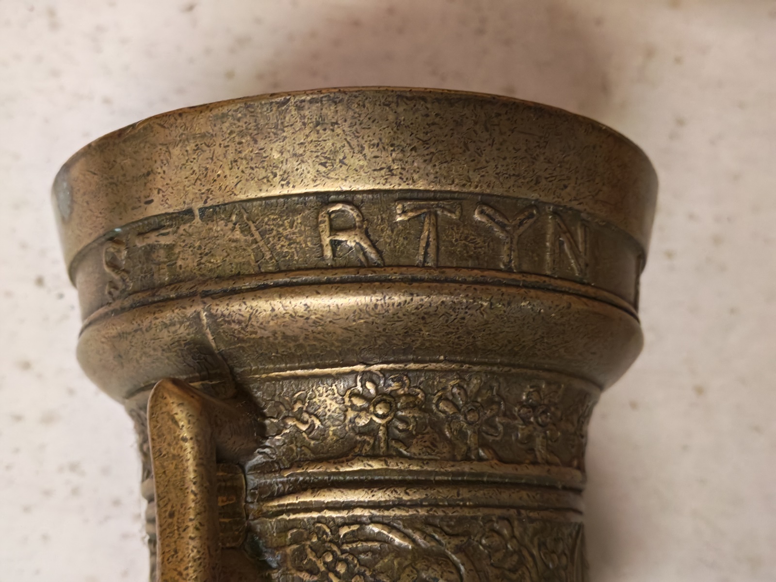 Rundumlaufende reiche inguß-Verzierung mit Richard Startyn 1623, DMxH ca. 13x12 cm, Stößellänge ca. 18 cm