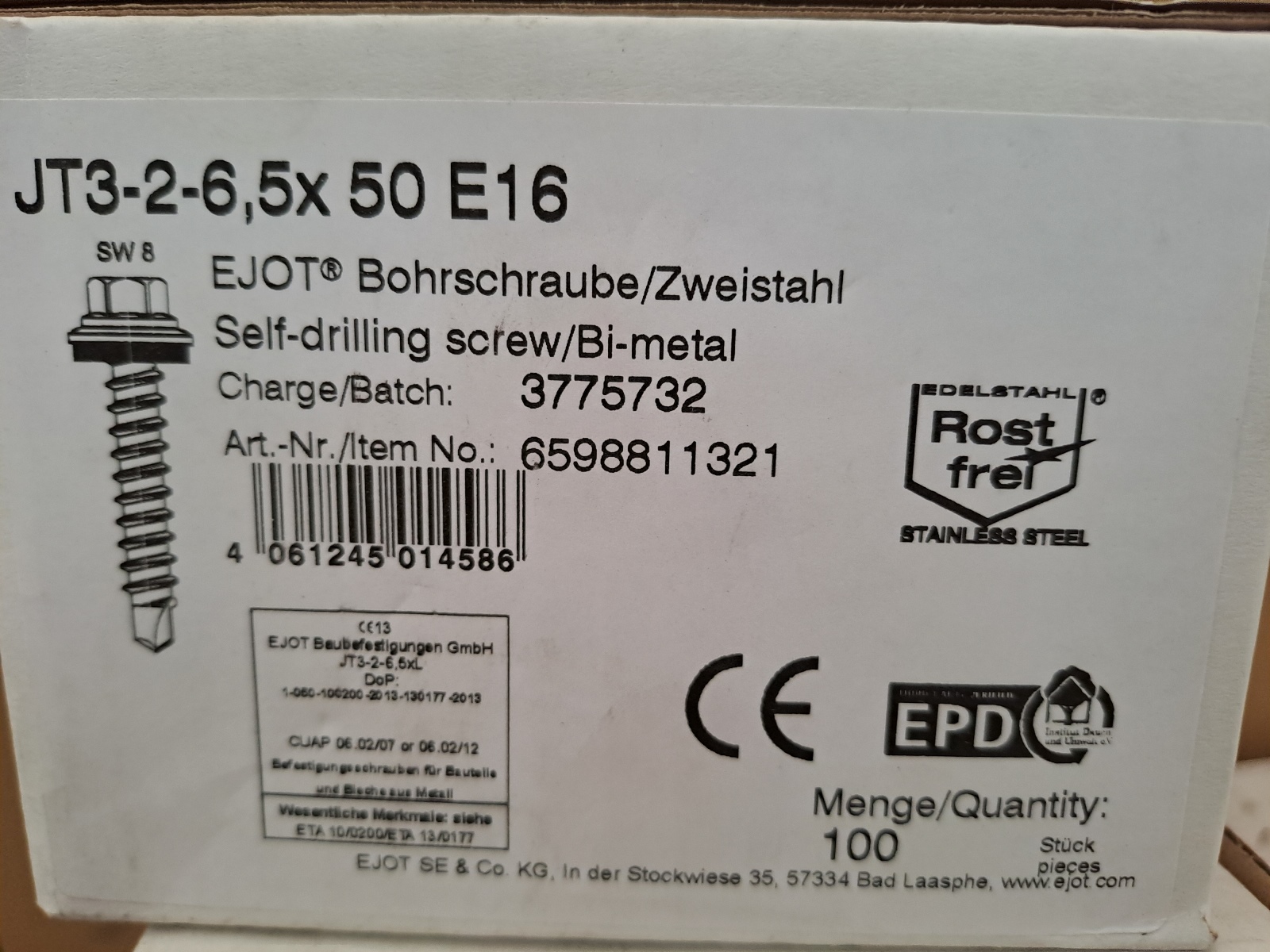 JT3-2-6,5x50 E 16, 14 Packungen zu je 100 Stk. Gesamt 1400 Stk. Und 37 Lose