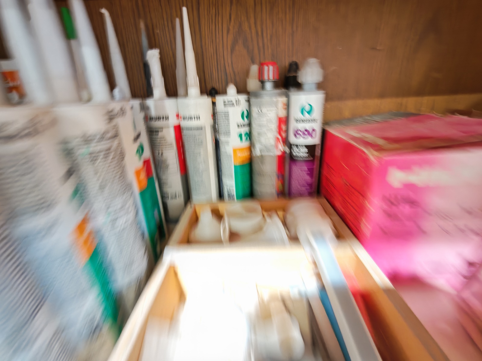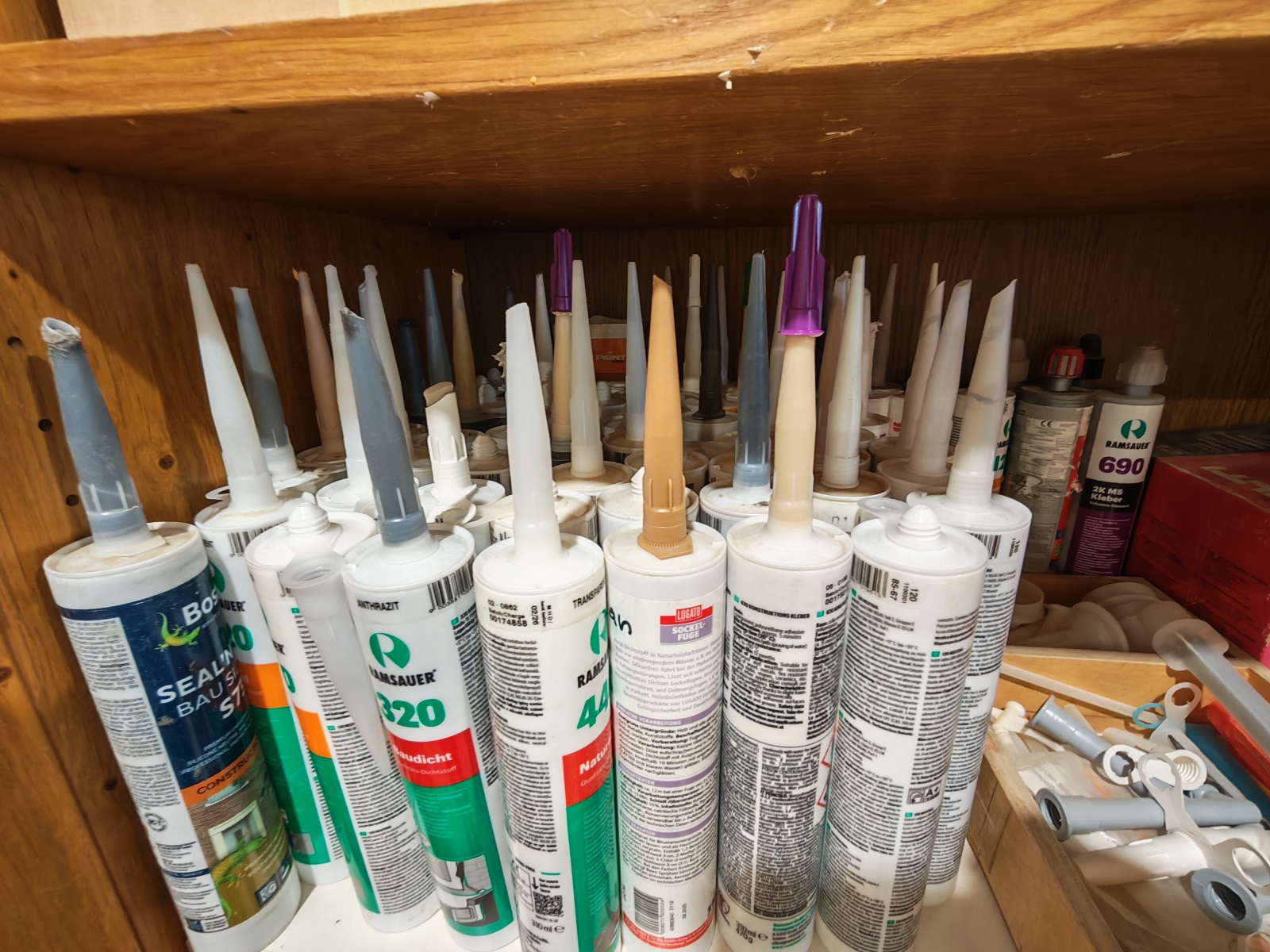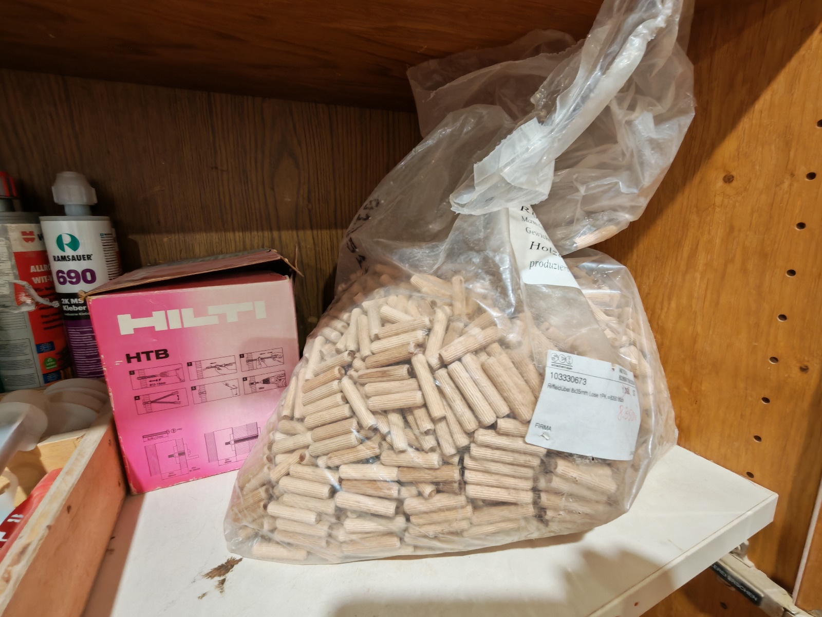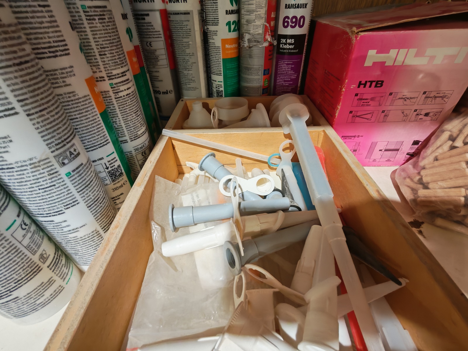 1 Regalebene Silikone, Kleber und Holzdübel