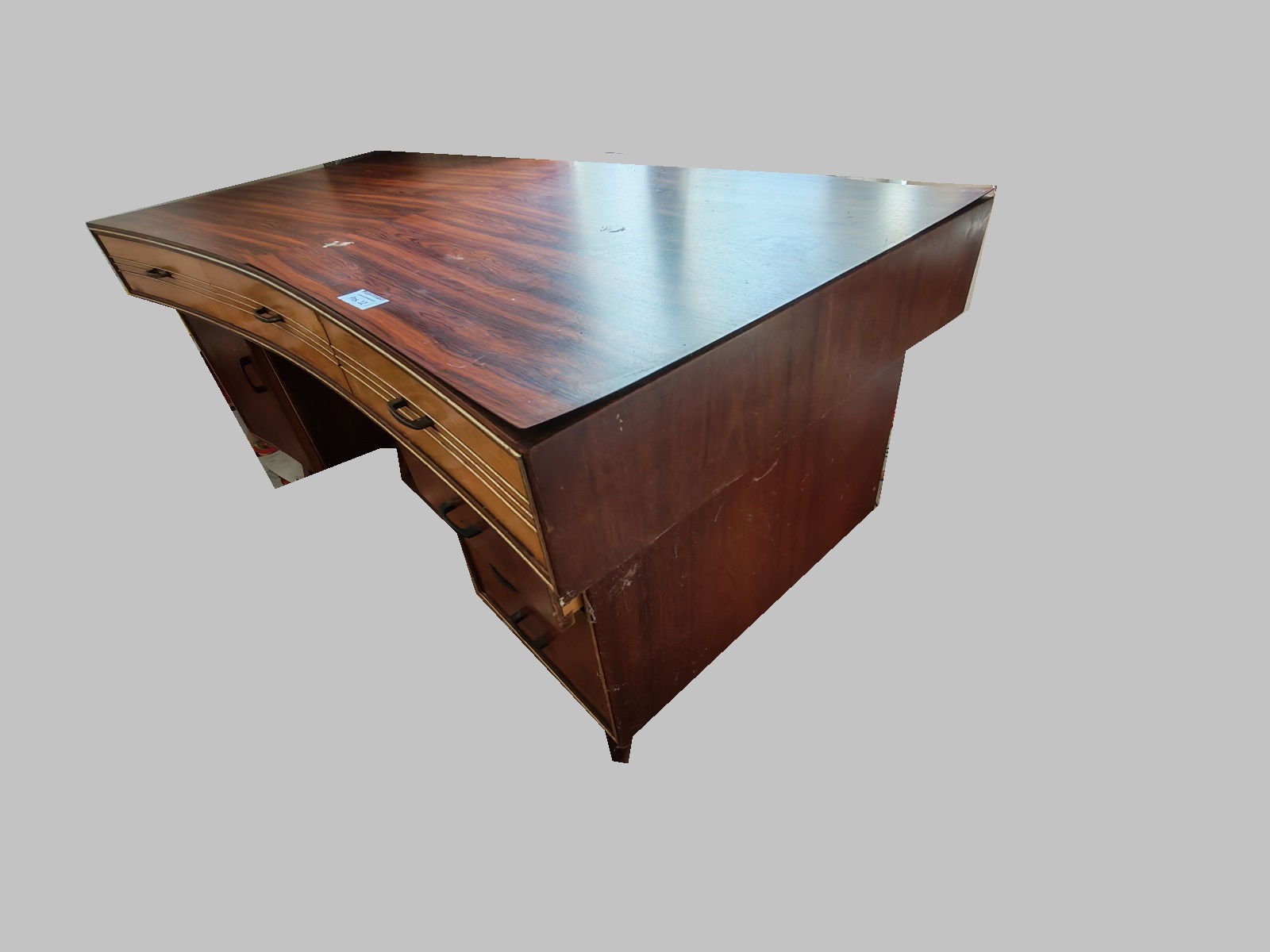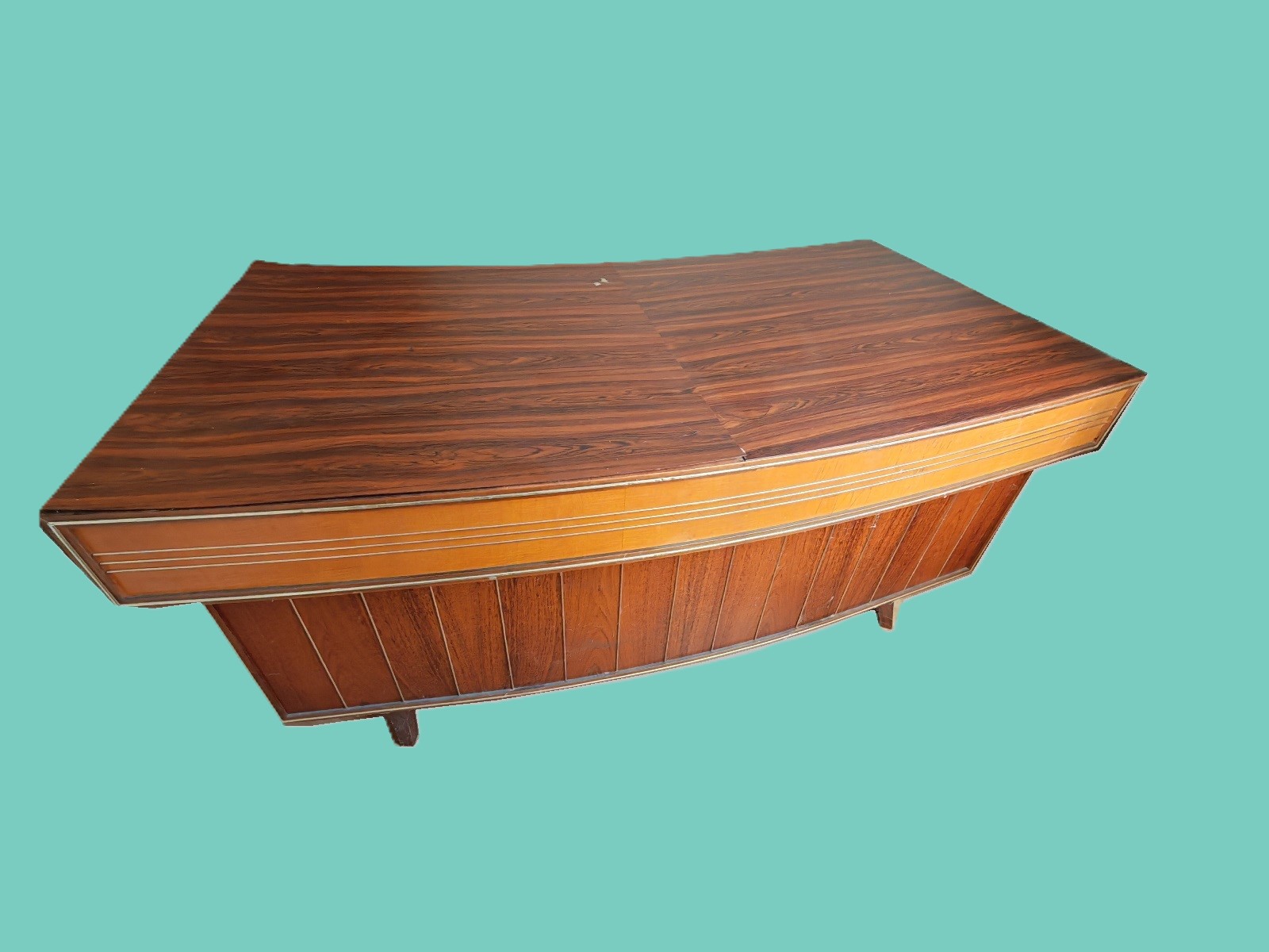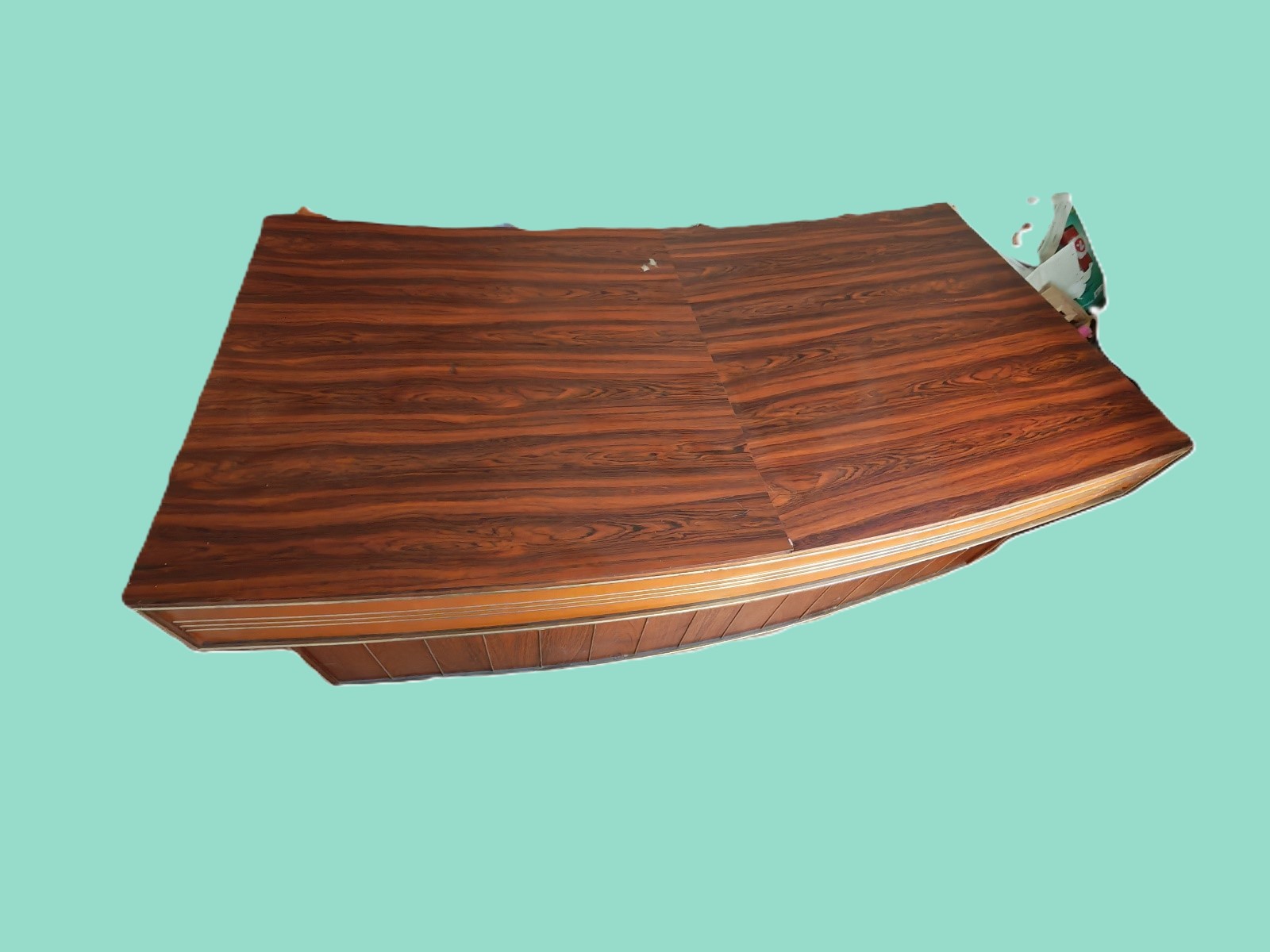 60-er Jahre Schreibtisch gebogen, BHT ca. 150x76x80 cm, Furnierplatten lösen sich, siehe Fotos, ACHTUNG: Steht im 1. Stock, kein Lift! ABHOLUNG AUSSCHLIESSLICH AM 14.4.2026 ZWISCHEN 8:00-9:00 UHR MÖGLICH!!!