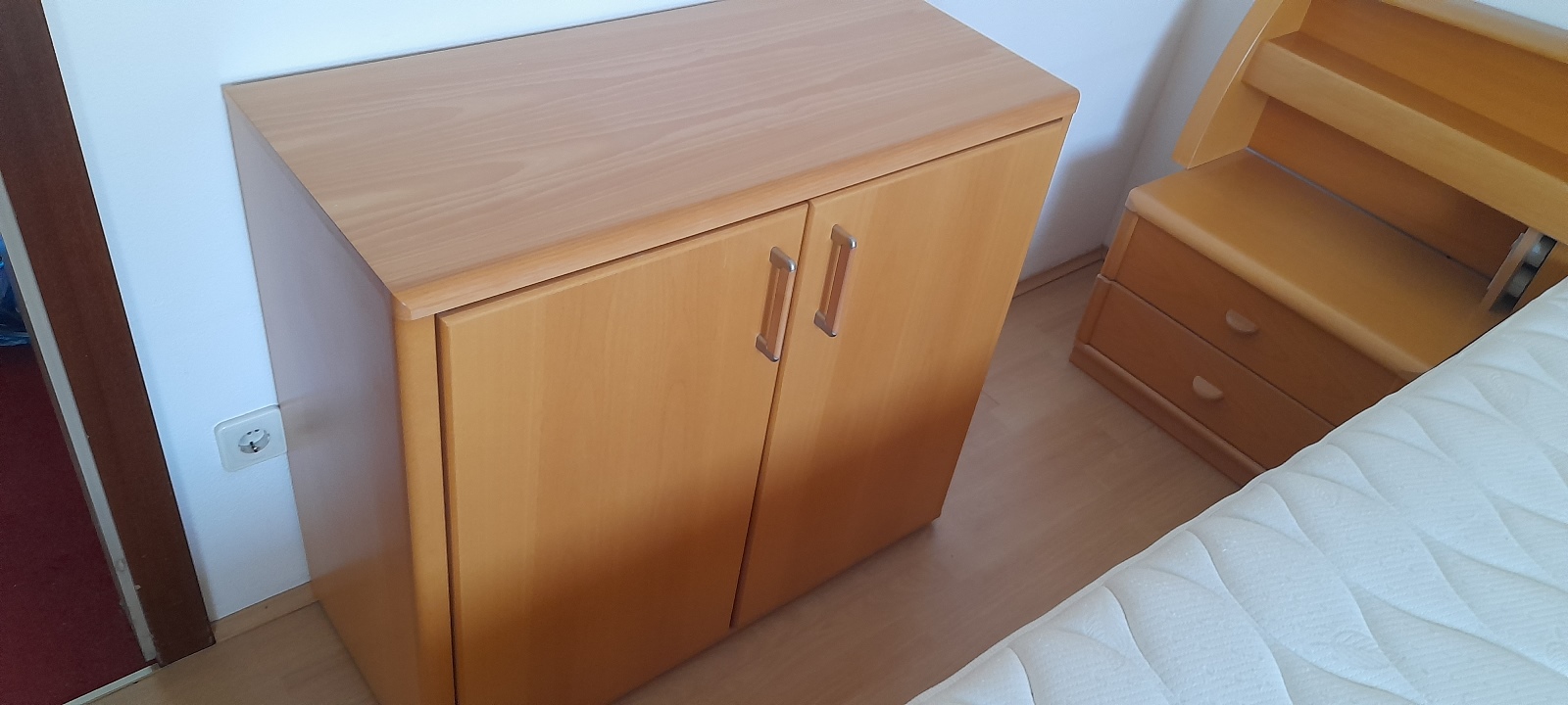 Komplett mit Doppelbett BT 180×200 cm mit Kopfüberbau B 305 cm und Nachtkästchen, Anrichte BHT 90x81x41 cm, Lattenrost, 6-türiger Kleiderschrank BHT 300x224x60 cm, Teppich, zum Selbstabbau