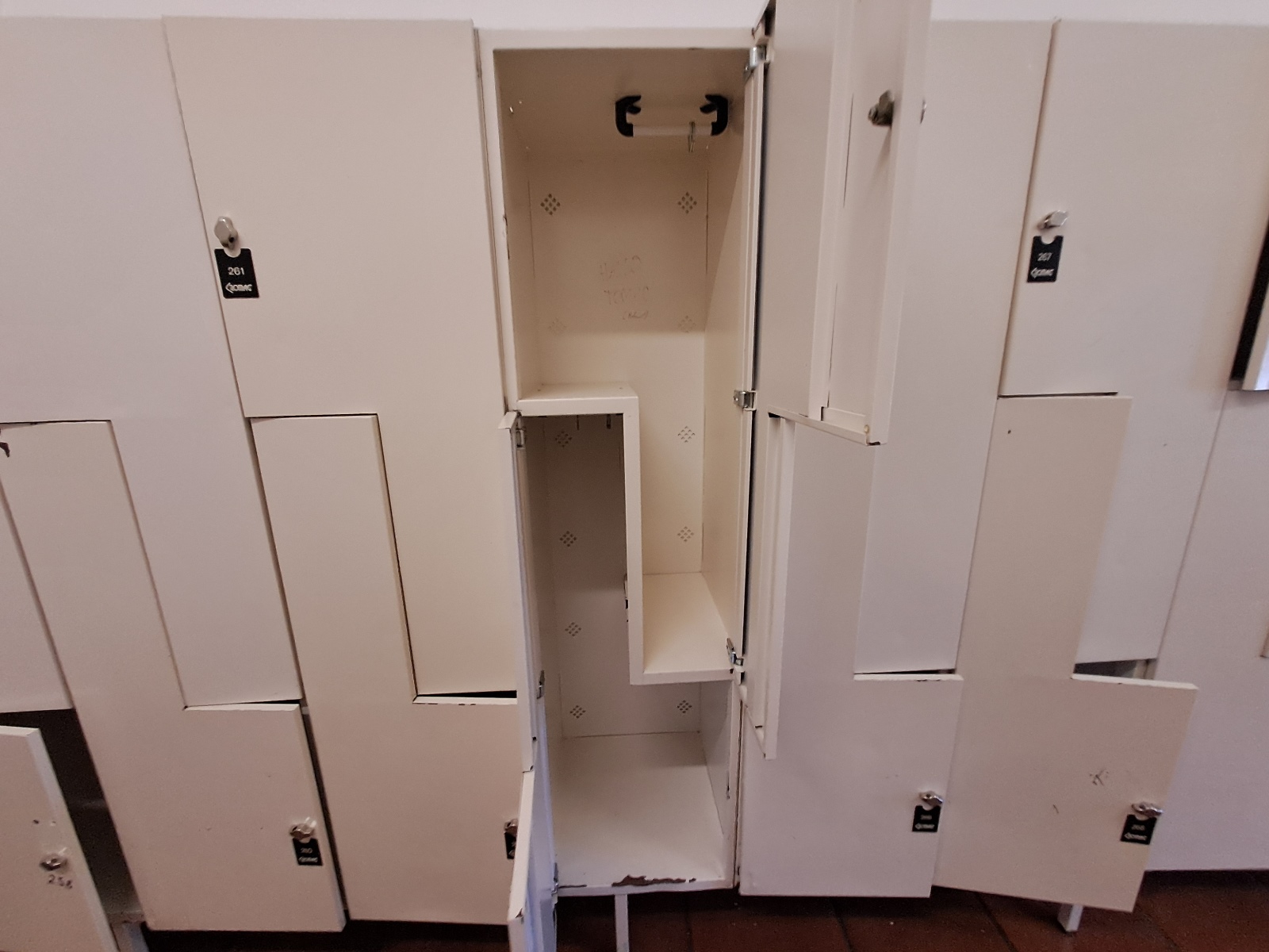 32 Spindkästen, 1 Zeile BHT ca. 760x200x50 cm, alle Spinde befinden sich im Erdgeschoß, Spinde sind mit Bogenschlössern zu verschließen, Bogenschlösser nicht enthalten, Selbstabbau in Garderobe 4, Raum 035