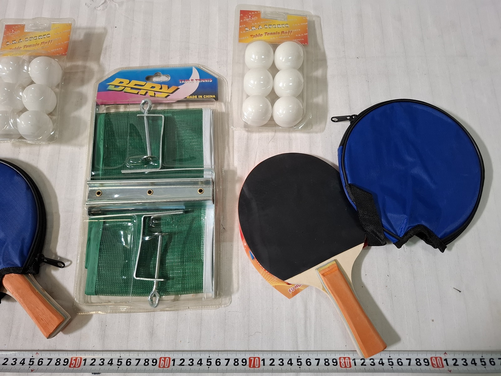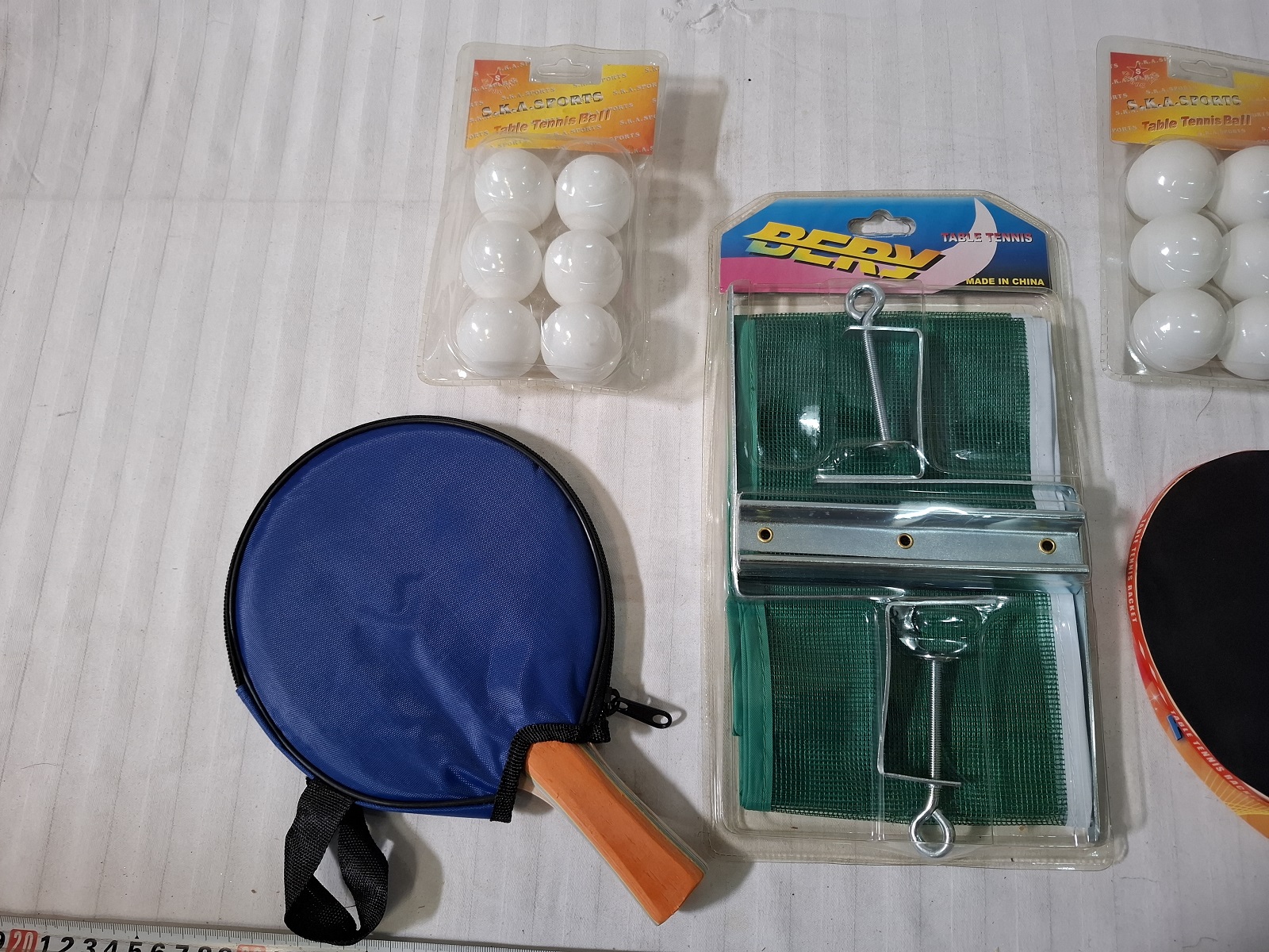 2 Stück Tischtennisschläger, 2 Stück Tischtennisbälle, 1 Stück Tischtennisnetz — bei den Schlägern löste sich der Beleg, muß nachgeklebt werden