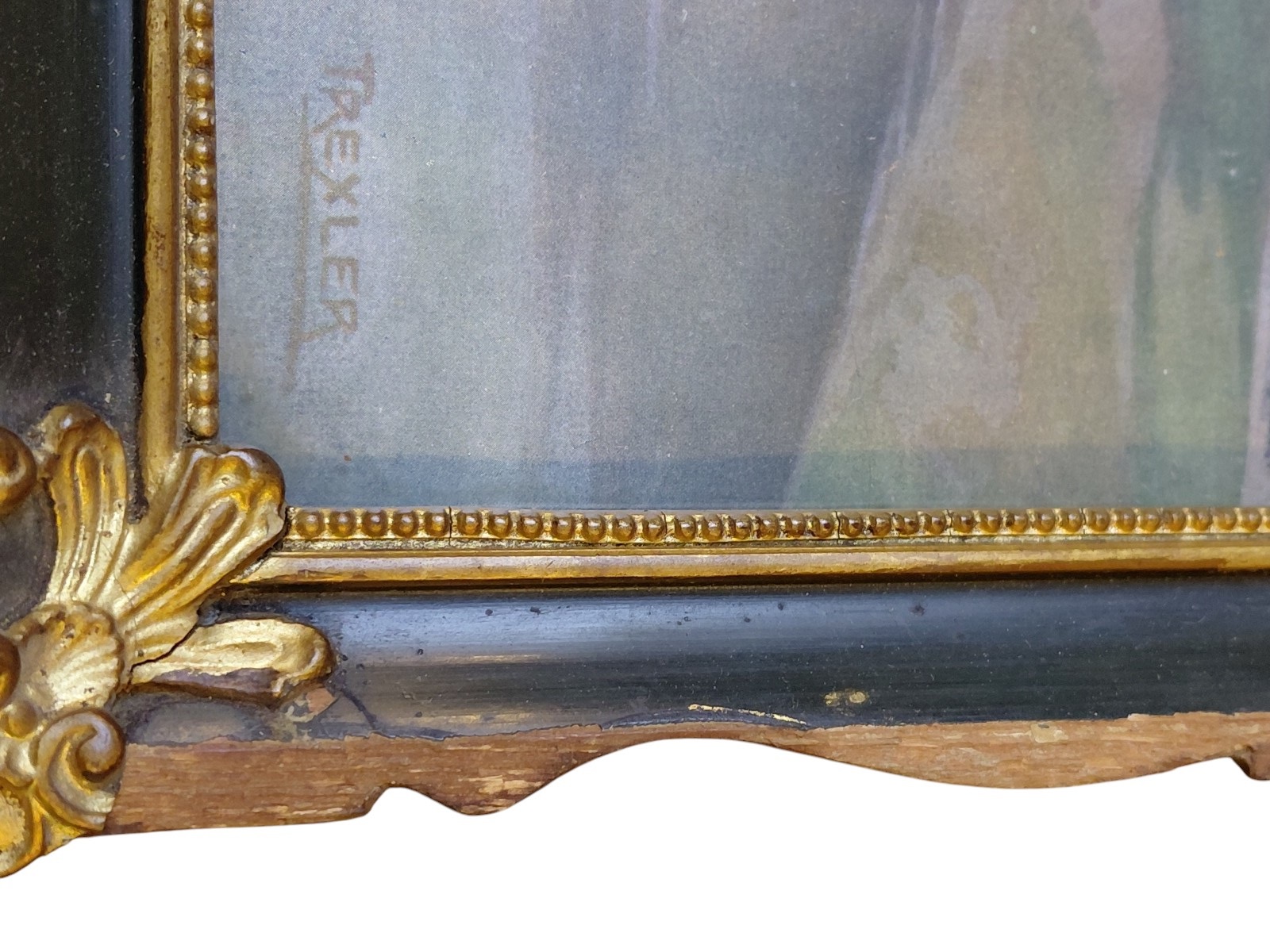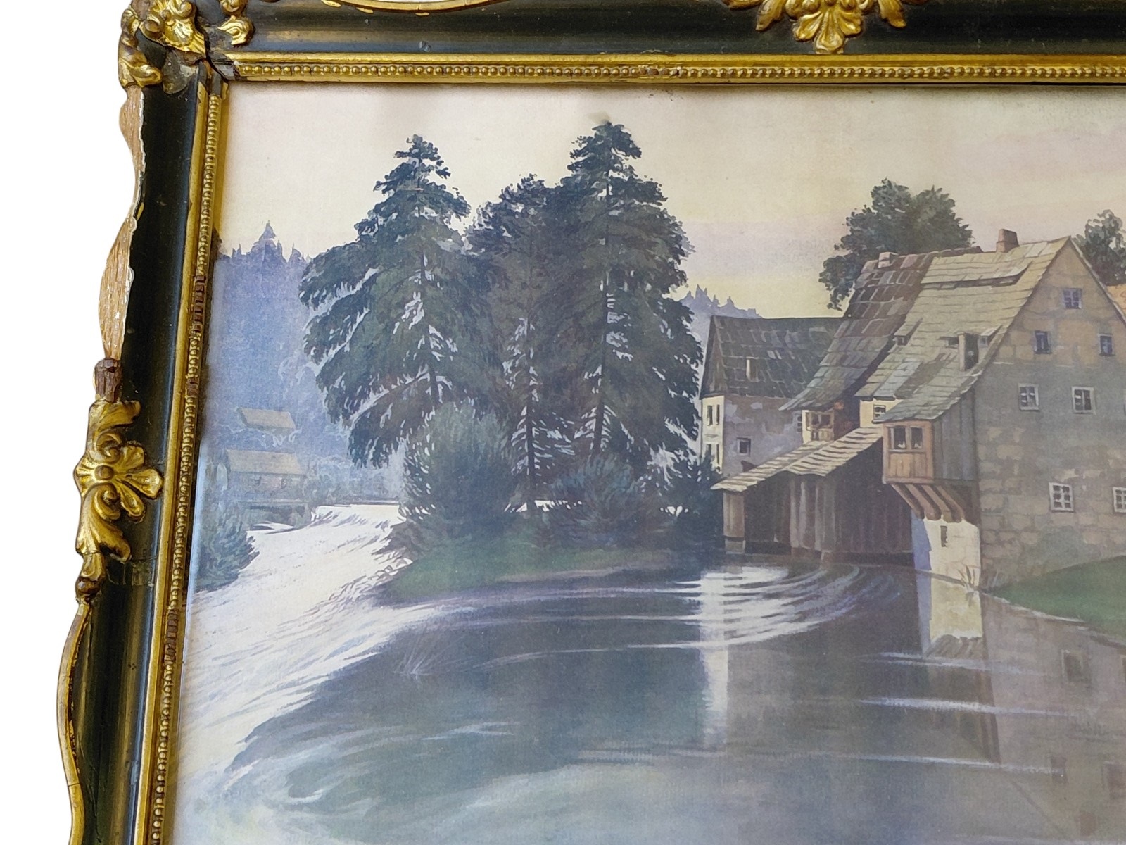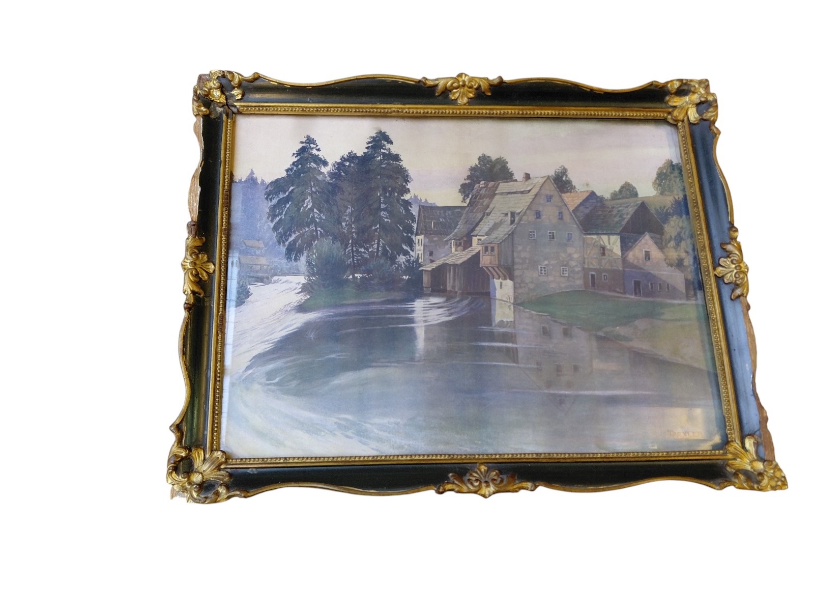Rahmen beschädigt, siehe Foto, gerahmt, verglast, ca. 45×35 cm, Bild fällt aus Rahmen