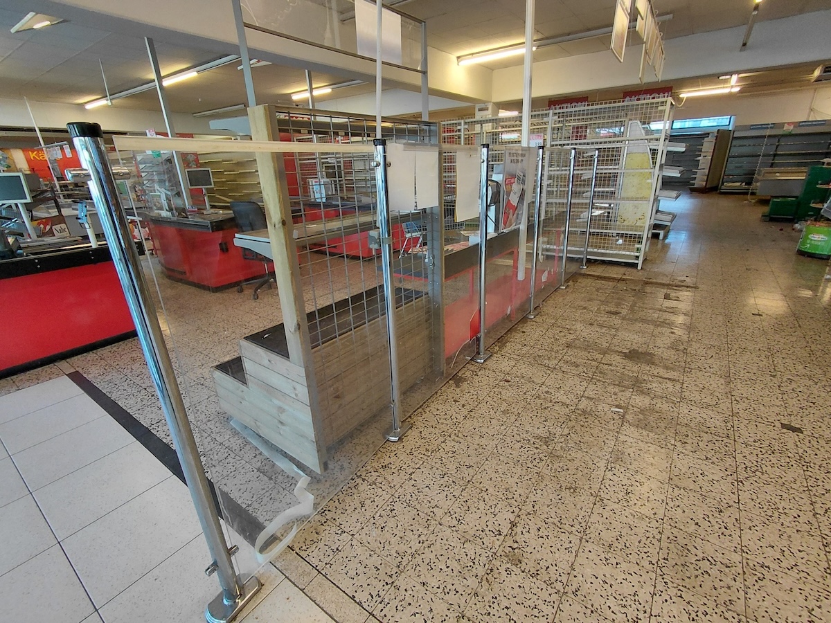 8 Metallsteher mit Plexiglasplatten, je ca. 95 cm breit, 1 Platte 38 cm breit, H je ca. ca. 145 cm, siehe Fotos – Selbstabbau!
