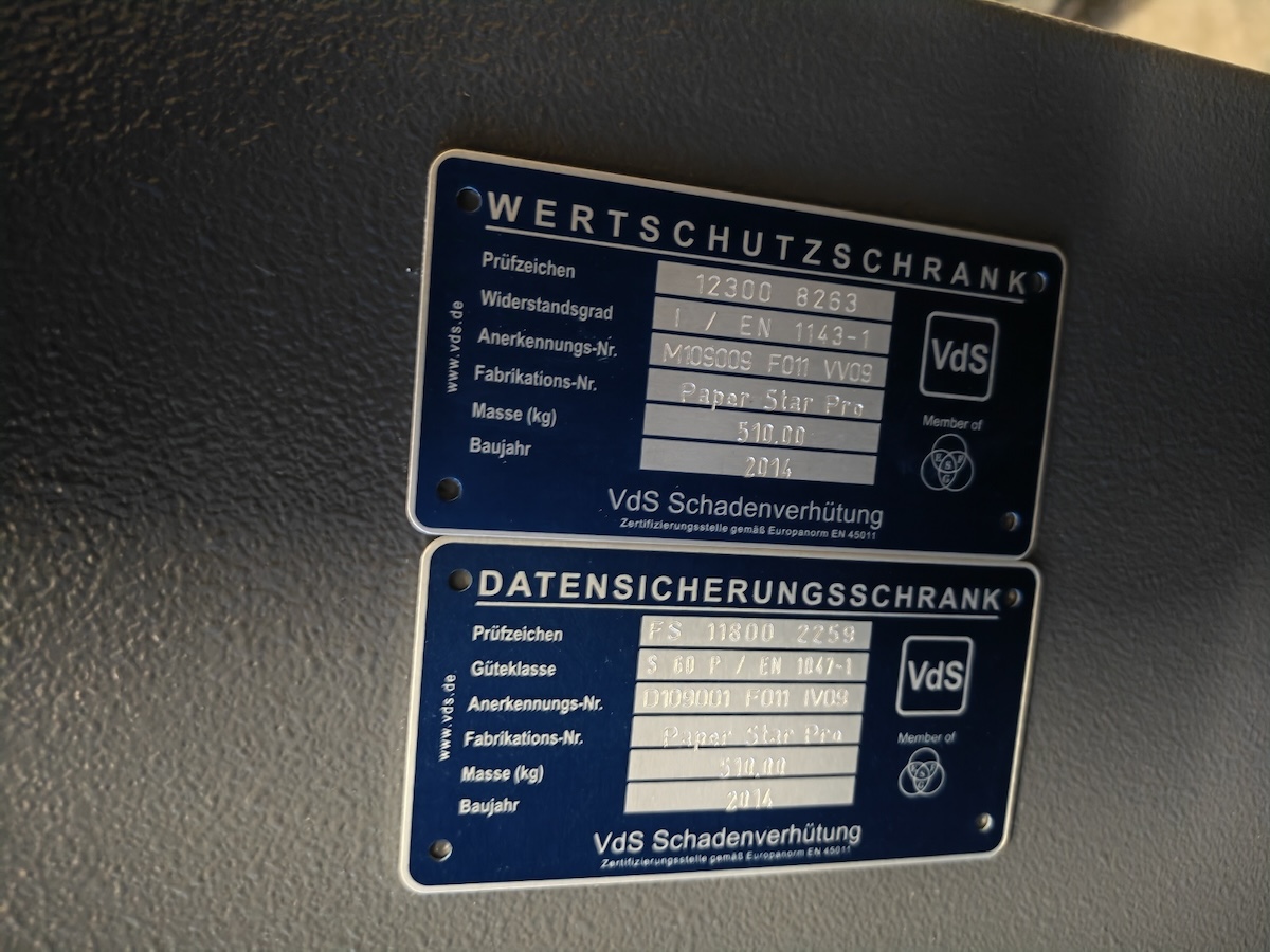 Widerstandsgrad I/EN 1143-1, 510 kg, BJ 2014, Güteklasse S60P, BHT ca. 69x184x50 cm, inklusive Schlüssel, Tür ausgehängt, siehe Typenschild, ohne Palette, siehe Fotos