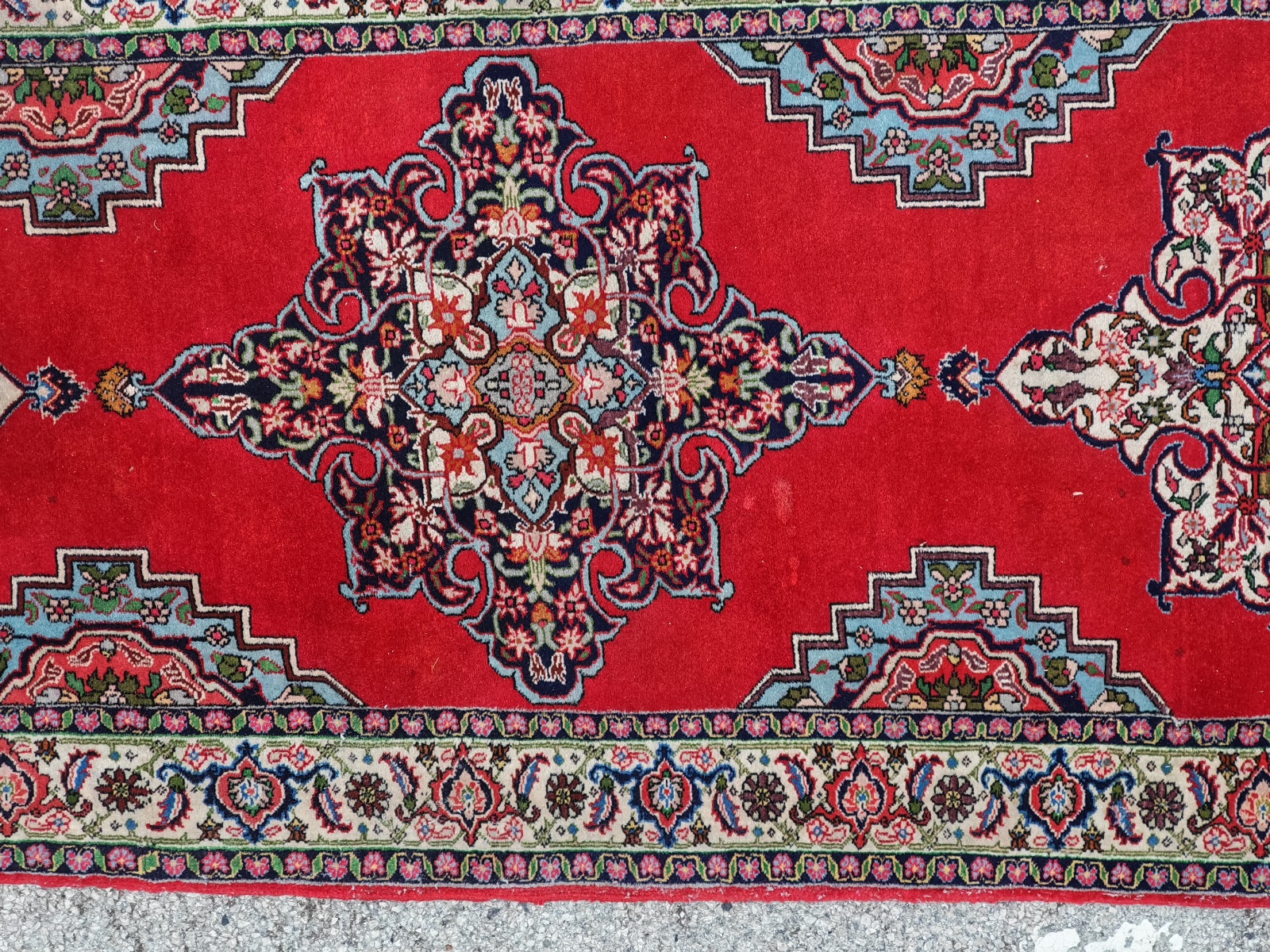 ca. 390×85 cm, chemische Reinigung wird empfohlen, schadhafte Stellen siehe Fotos
