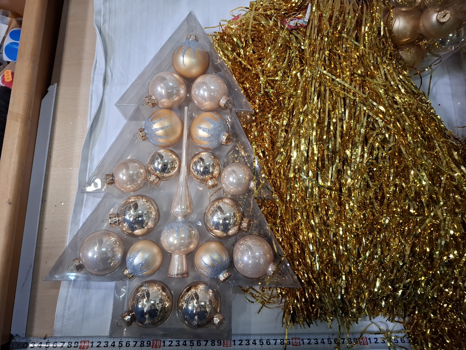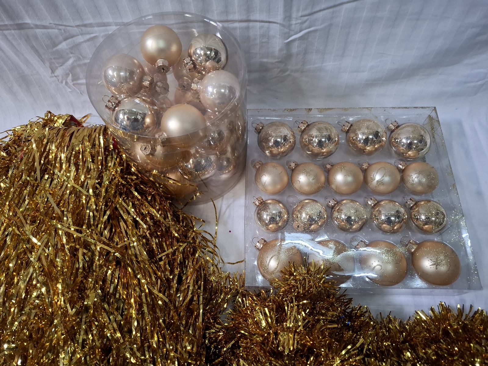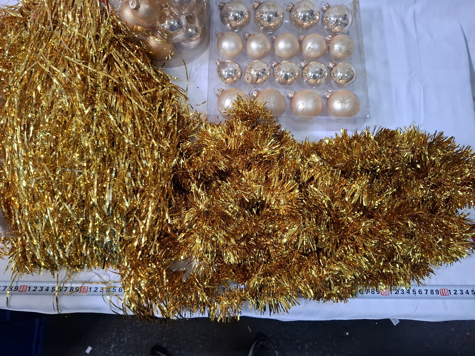 3 Packungen Christbaumkugeln aus Glas, 30 Packungen Lametta und 20 Packungen Girlanden