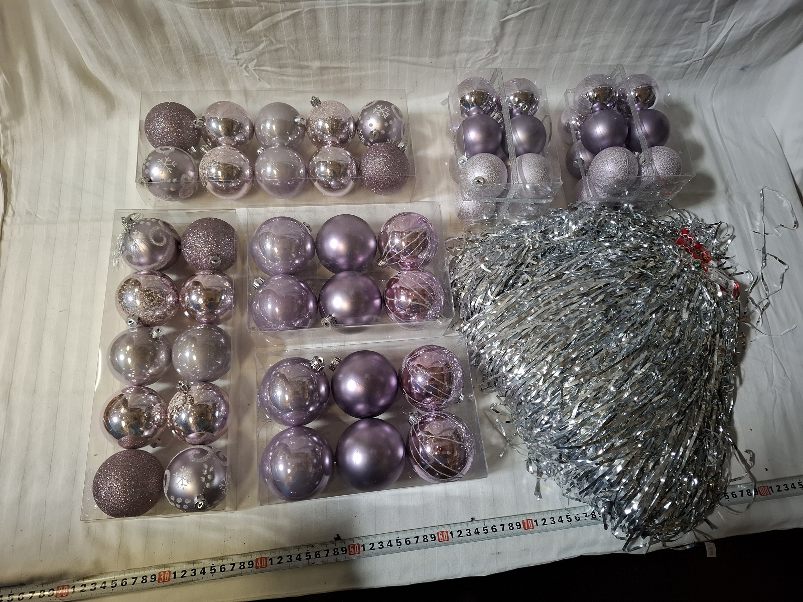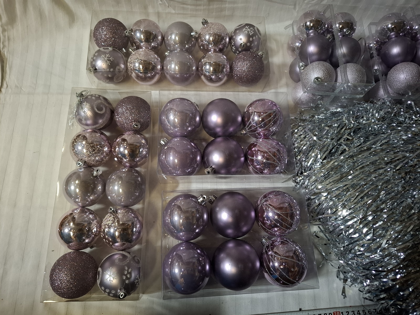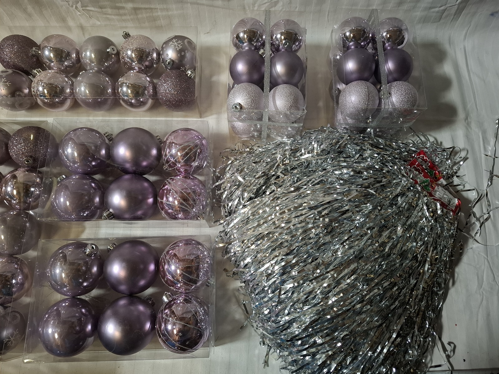 6 Packungen Christbaumkugeln aus Kunststoff und 20 Packungen Lametta