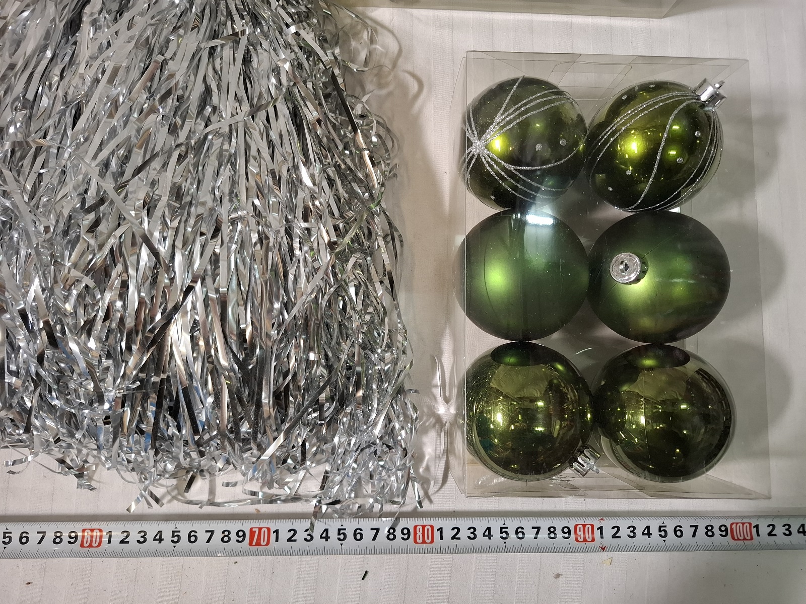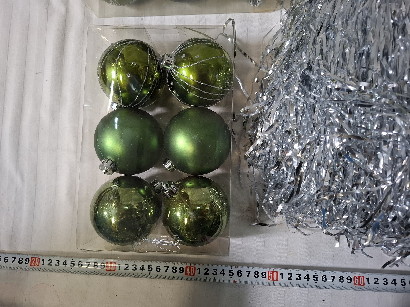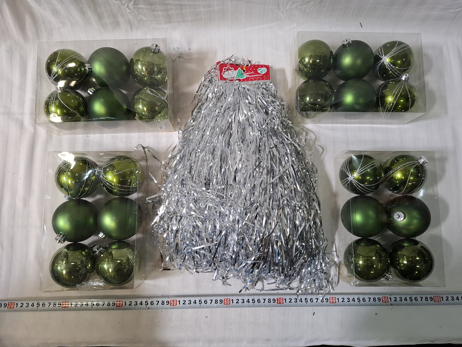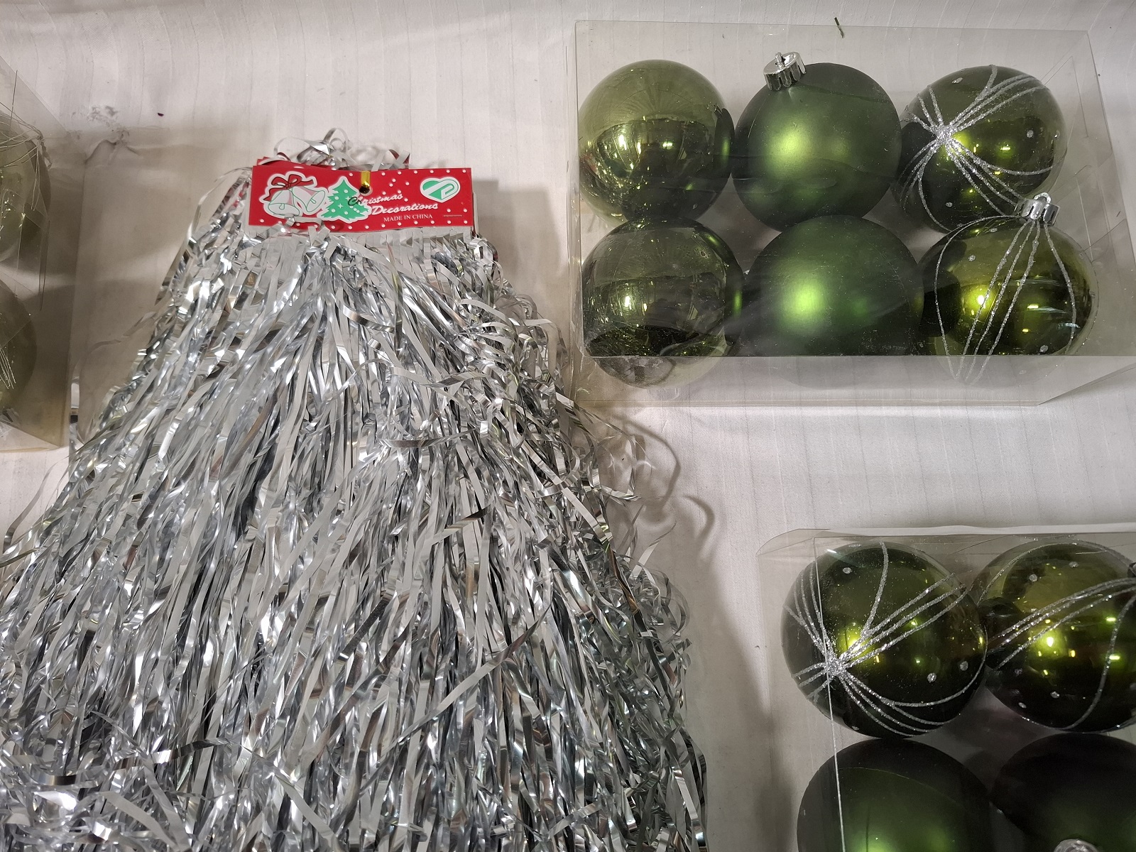 4 Packungen Christbaumkugeln aus Kunststoff, 20 Packungen Lametta