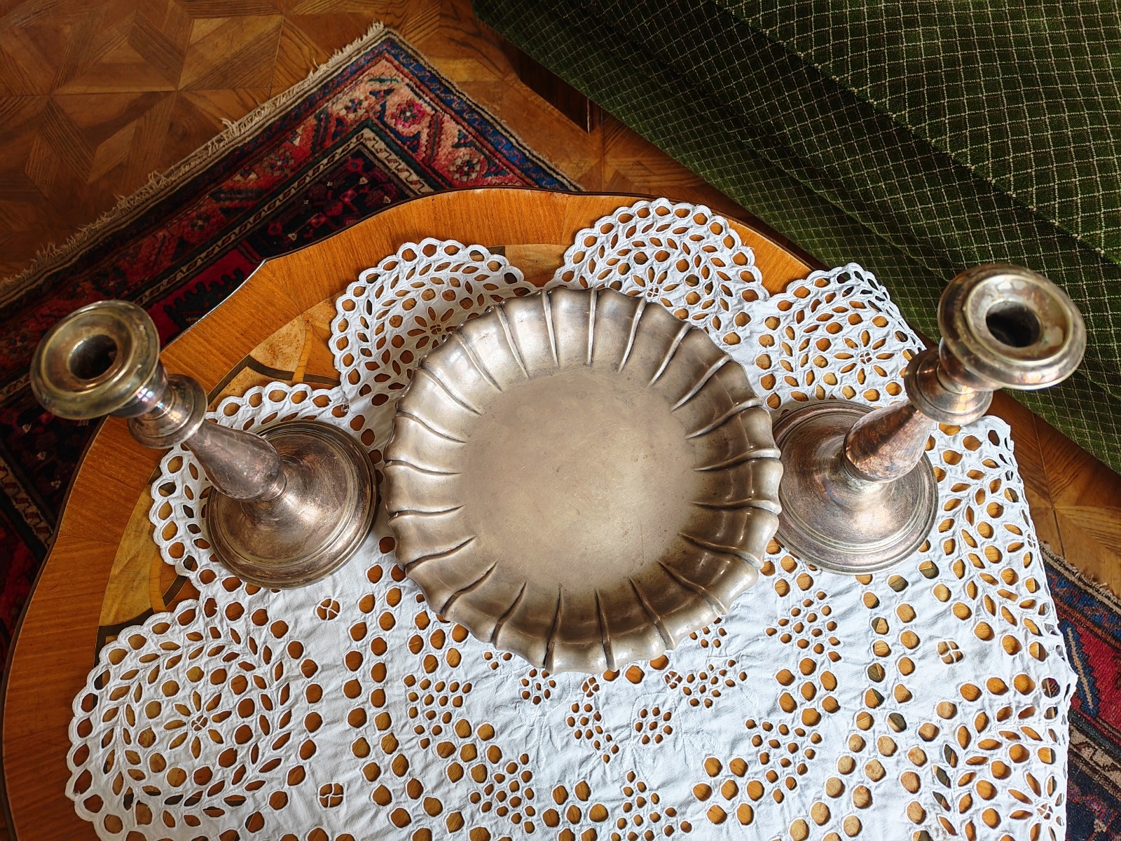 inklusive Schale, versilbert, teilweise beschädigt, H je ca. 26 cm, DM ca. 30 cm