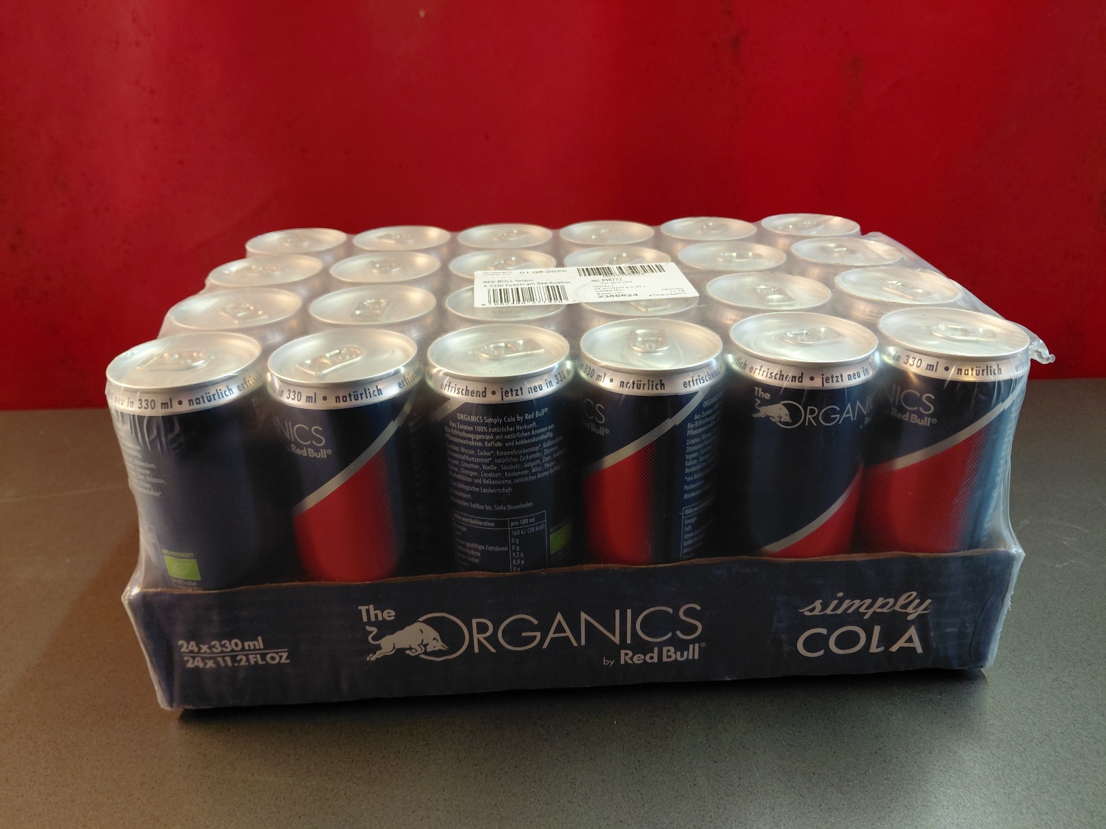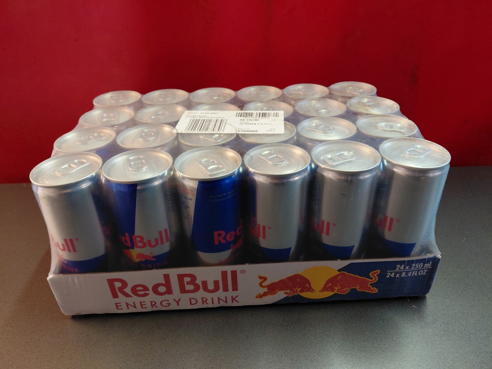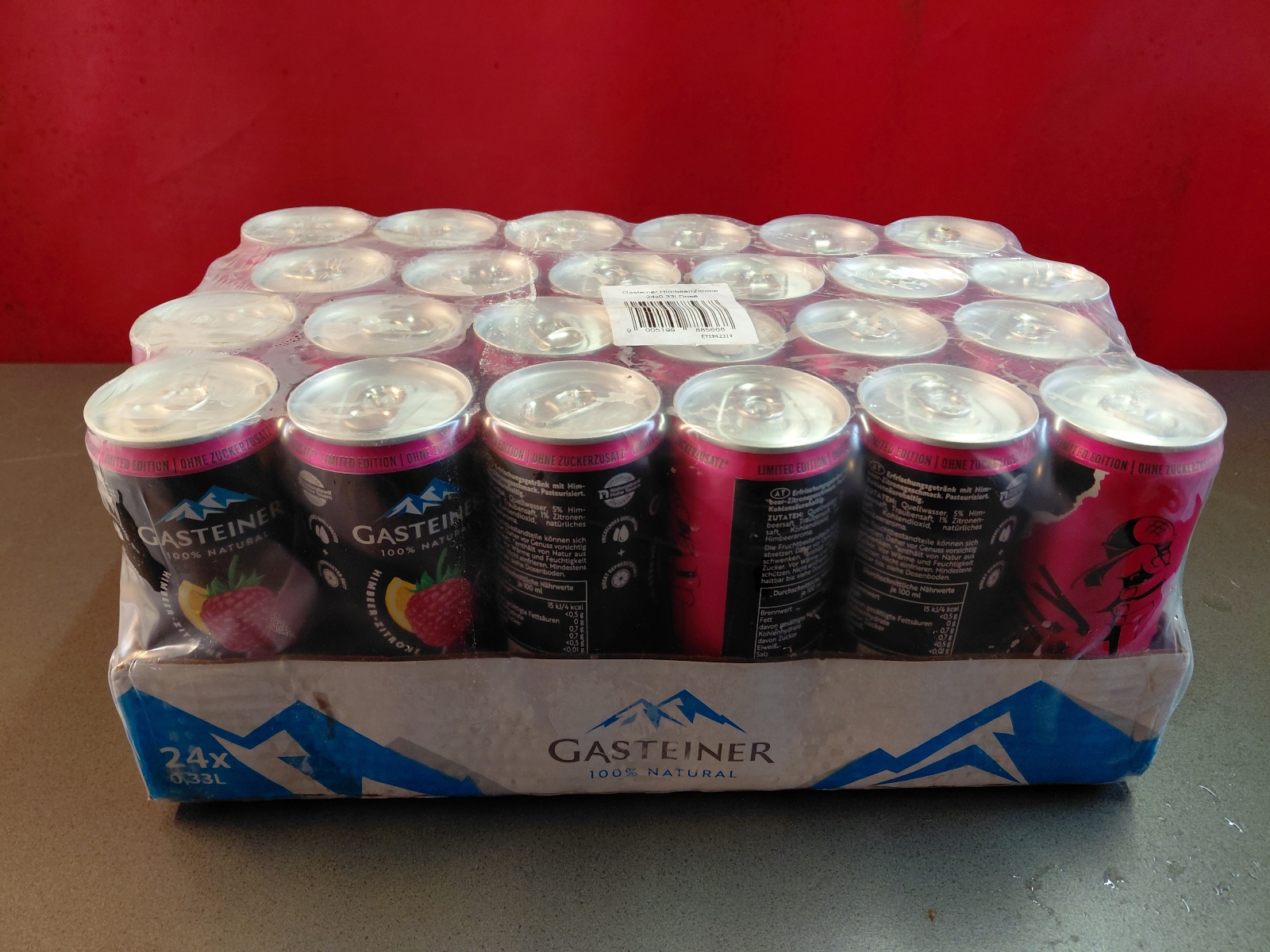 Red Bull, Red Bull Organics Cola und Fizzy Peach, Rauch Eistee, Gasteiner Mineralwasser prickelnd und still, Gasteiner Infinity Water Lemon und Apfel, sowie Himber-Zitrone und Holunder-Limette, abgepackt in Trays zu je 12 bzw. 24 Dosen oder Petflaschen mit Inhalten von 0,25-0,5 l, inklusive Pfandgebühr