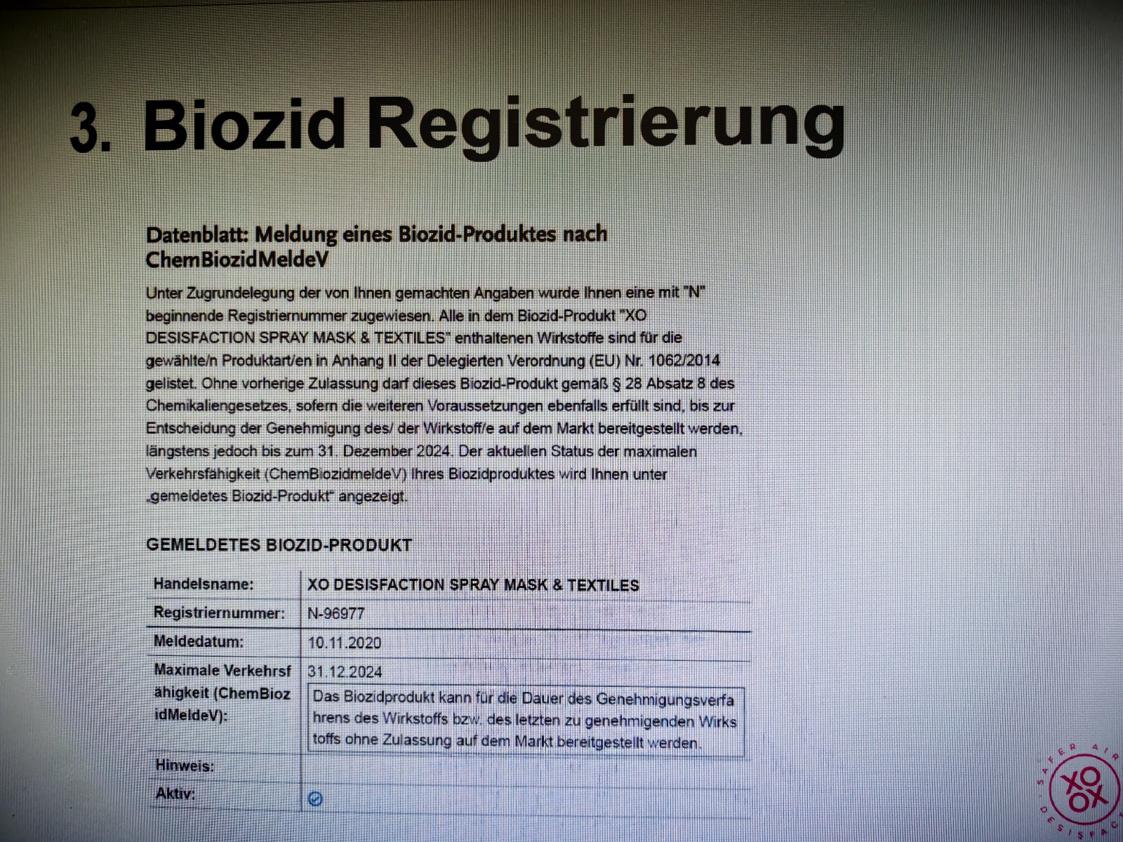 20 Pakete XO Desinfection Masken und Textilsprays, jedes Paket beinhaltet 42 Fläschchen zu je 50 ml Desinfektionssprays, MHD überschritten